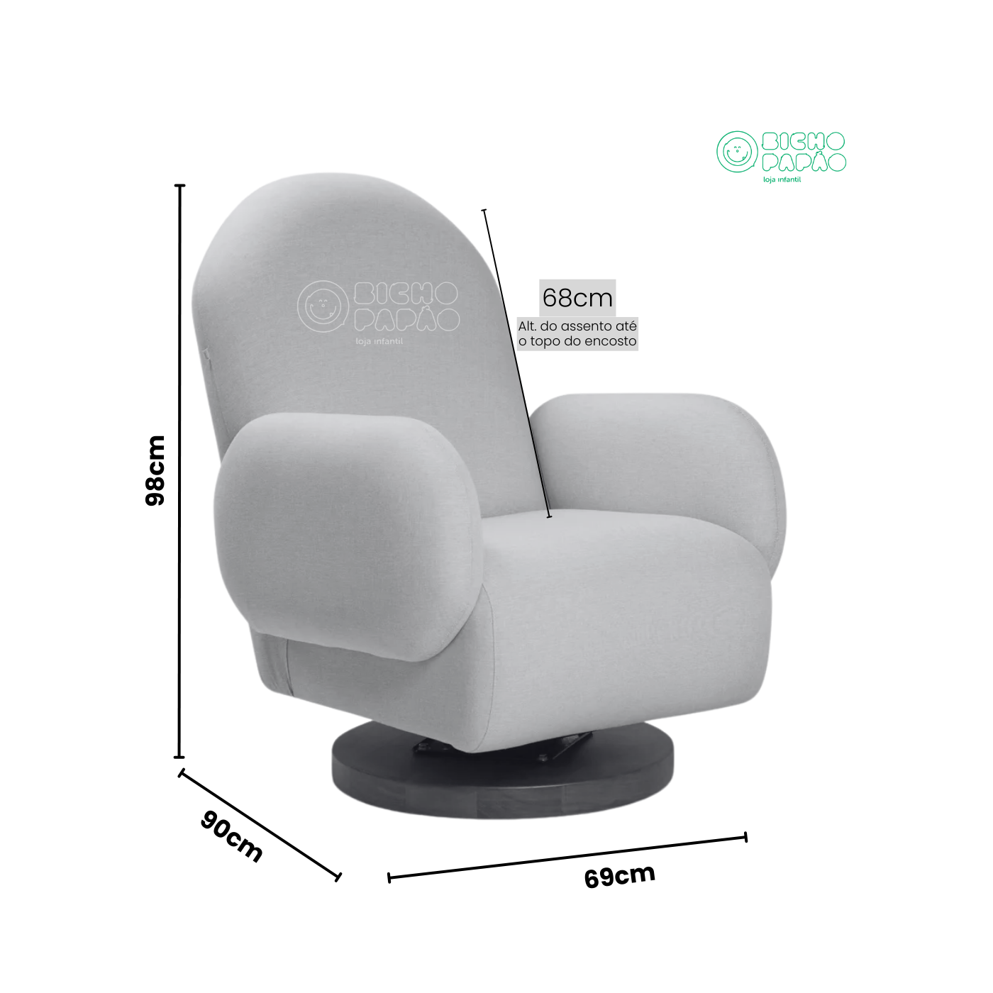 • Base de Giro e Balanço Inovadora: Mecanismo exclusivo no mercado nacional, com base redonda em madeira maciça e sistema que permite girar 360º e balançar suavemente.