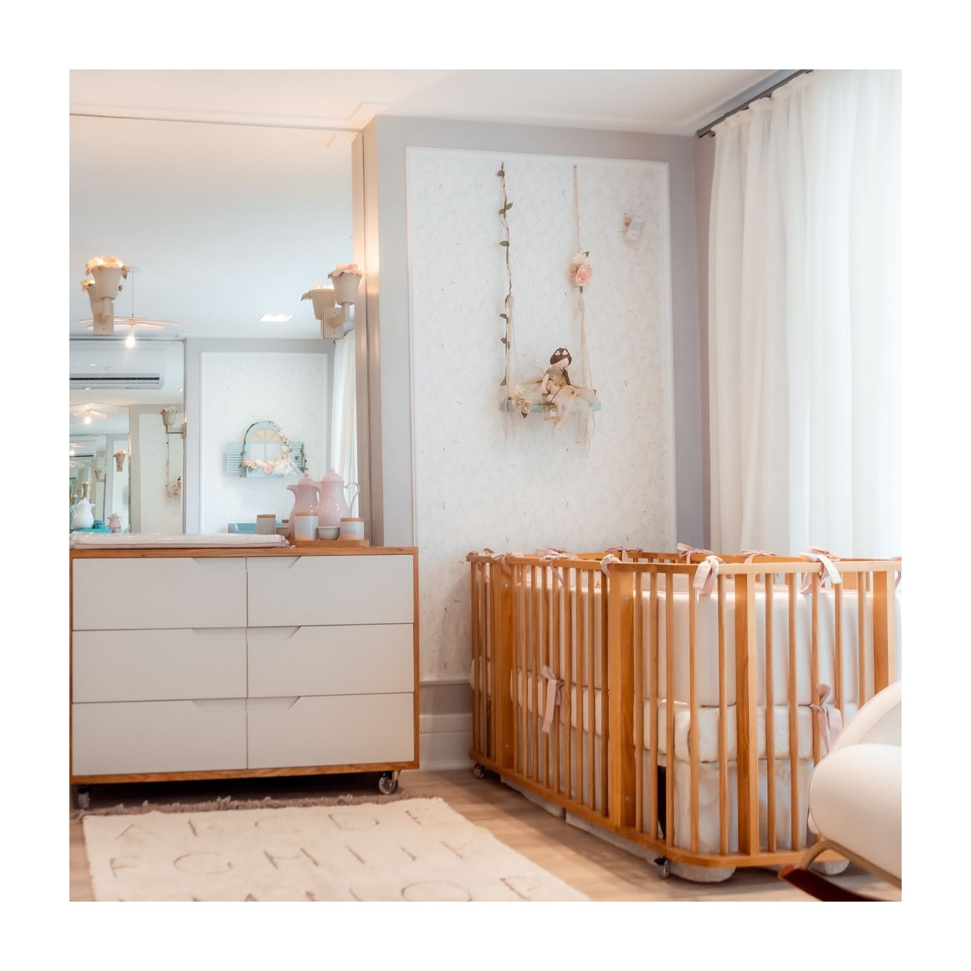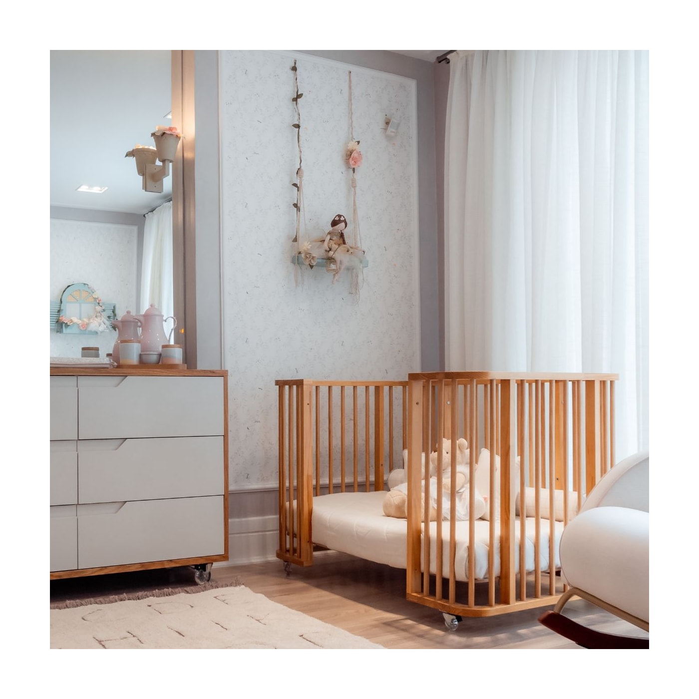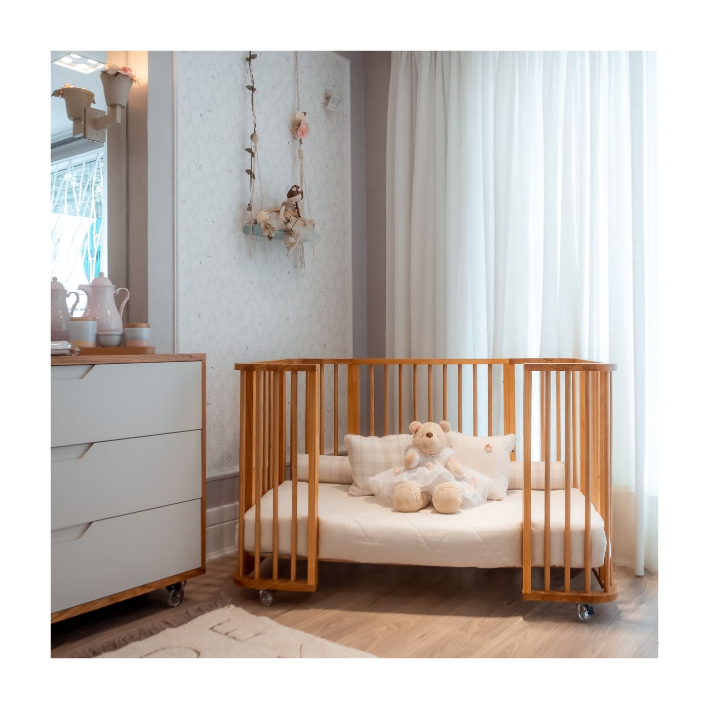 O berço em madeira oferece segurança e conforto para noites tranquilas, enquanto a cômoda funcional é ideal para organizar roupinhas e acessórios, deixando tudo ao alcance das mãos. Aposte em peças de decoração delicadas, como almofadas, quadros infantis e um tapete macio, para criar um ambiente acolhedor e cheio de amor.