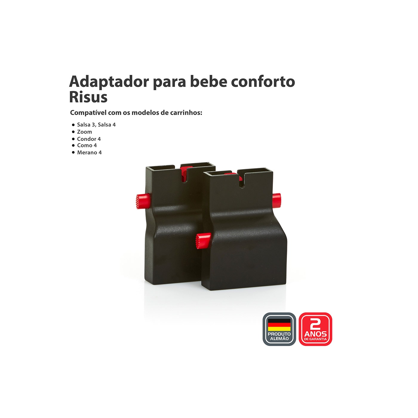 Compatível com o Bebê Conforto Risus ABC Design, este adaptador possui indicações claras dos lados, facilitando sua remoção da estrutura do carrinho ou do bebê conforto através de um botão dedicado. Além disso, pode permanecer instalado na estrutura durante o fechamento do carrinho.