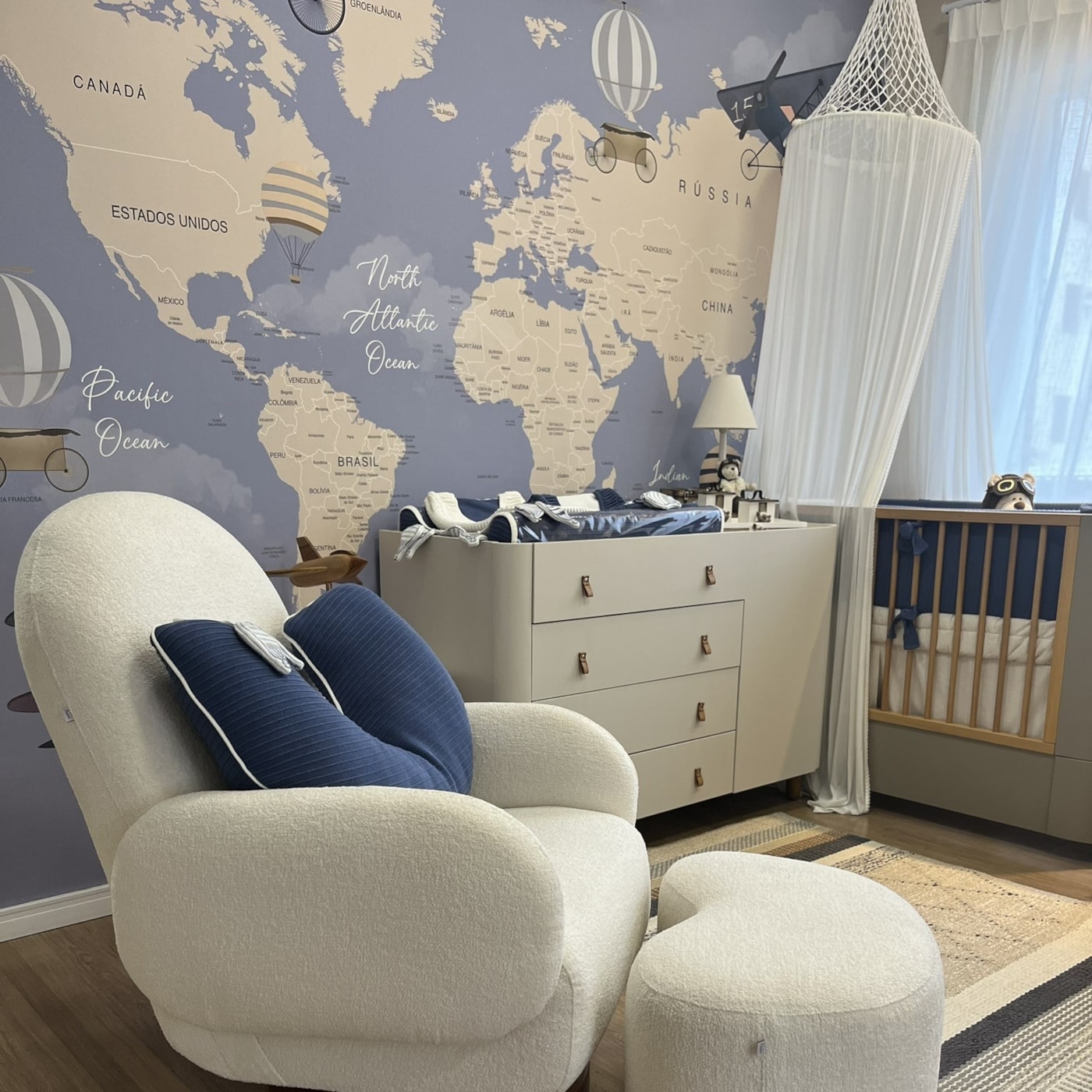 Dica de decoração: combine com almofadas, rolos e mantas no mesmo tema para criar um quarto de bebê aviador acolhedor, elegante e cheio de detalhes encantadores.
