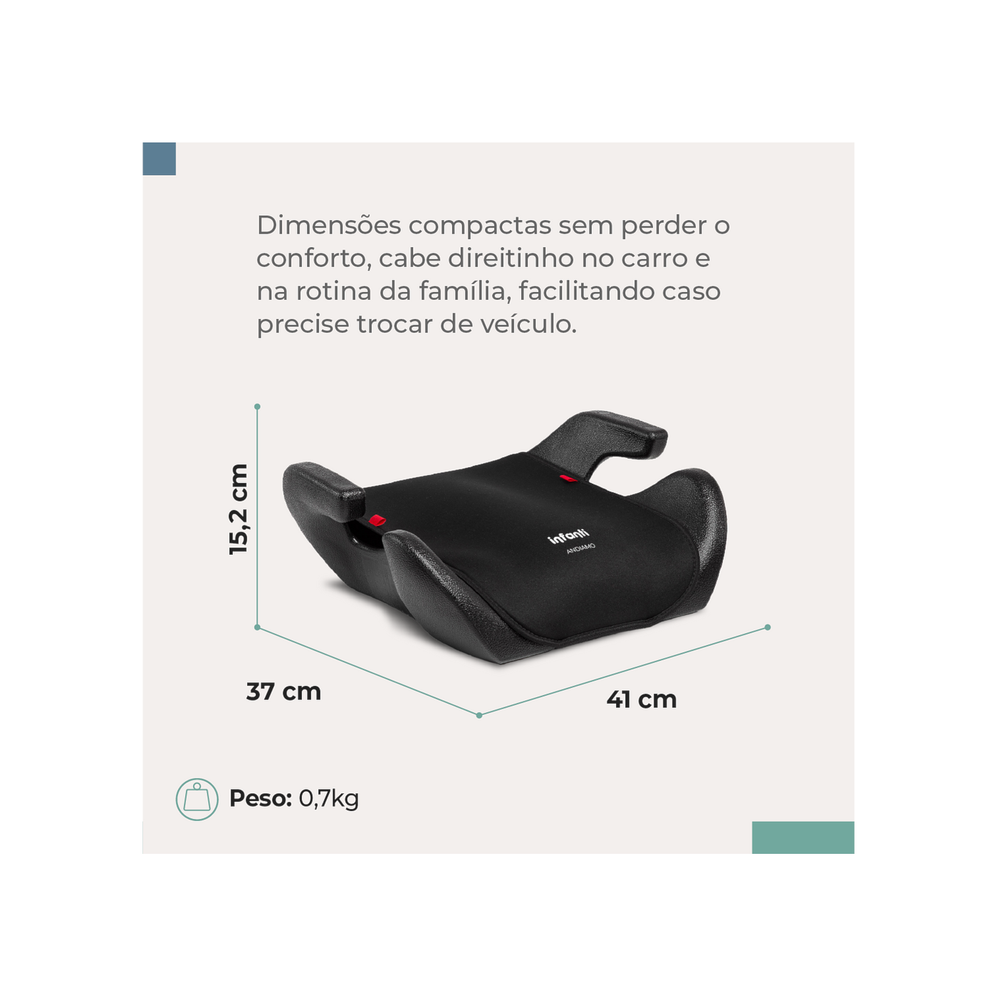 Com menos de 1kg, o Booster Andiamo é fácil de transportar, instalar e trocar de carro sempre que necessário. Sua estrutura é resistente e conta com apoio de braços, que garante mais ergonomia e melhor posicionamento das pernas durante o trajeto.