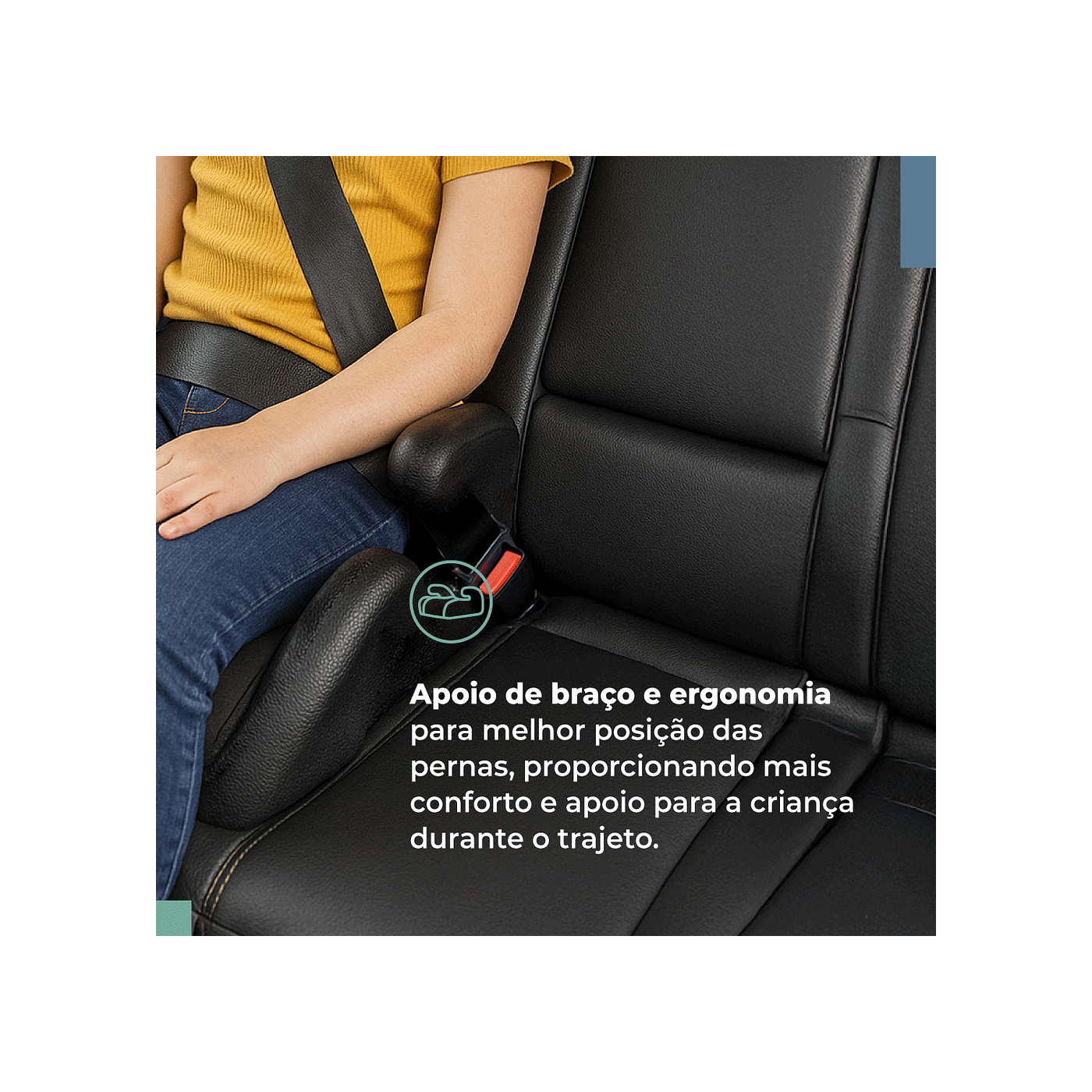 Indicado para os grupos 2 e 3 (15 a 36 kg), o booster é instalado com o cinto de 3 pontos do próprio veículo e possui sinalização para garantir o uso correto.