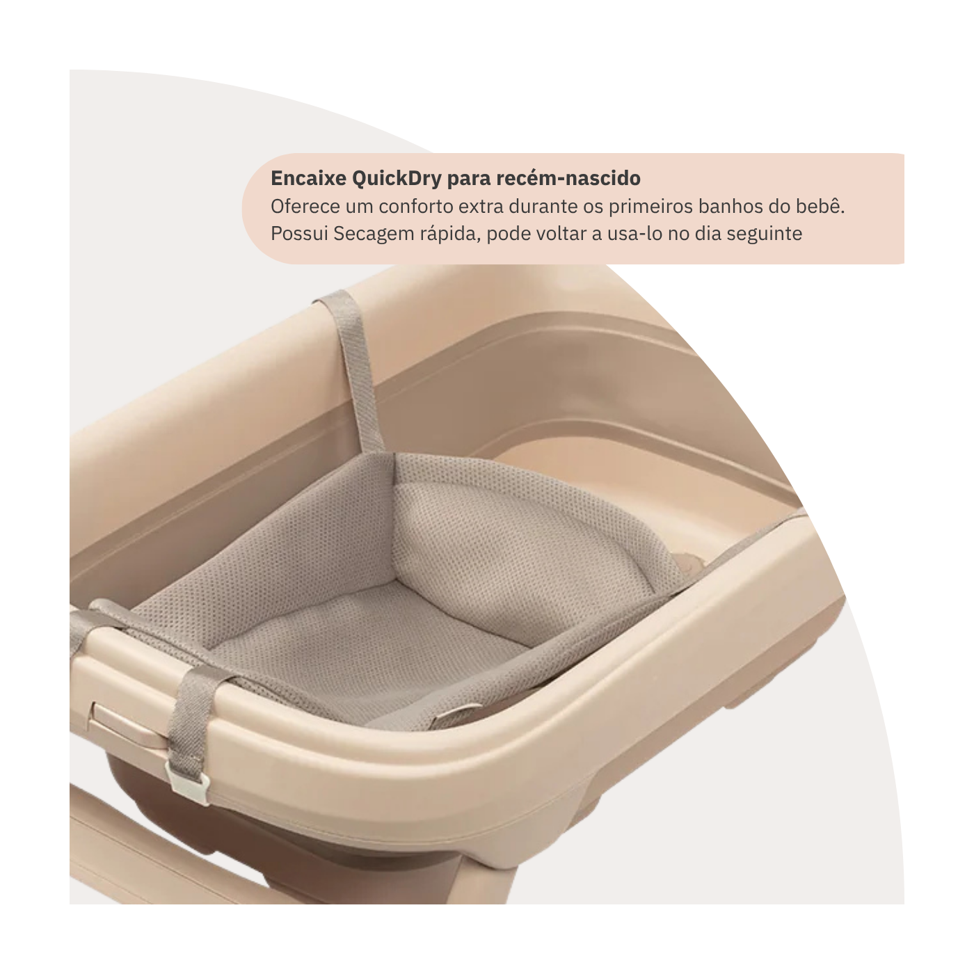 Para recém-nascidos, acompanha o encaixe/redutor QuickDry, que oferece suporte adequado e confortável, além de secagem rápida, mantendo a higiene e praticidade no uso diário.