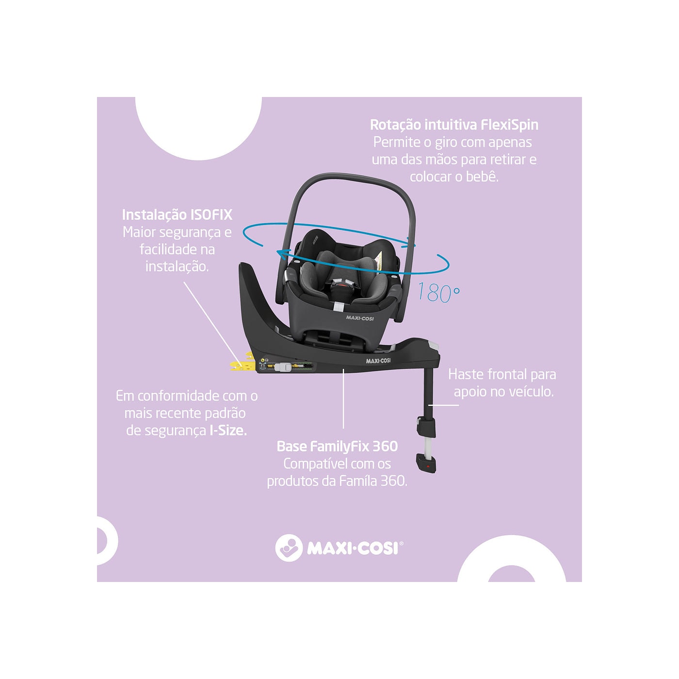 Este produto é um bebê conforto com base FamilyFix 360, com tecnologia FlexSpin, que permite o giro para retirar e colocar o seu filho no carro. Isso tudo de forma intuitiva e prática, com apenas uma só mão, tornando tarefa muito mais fácil para você.