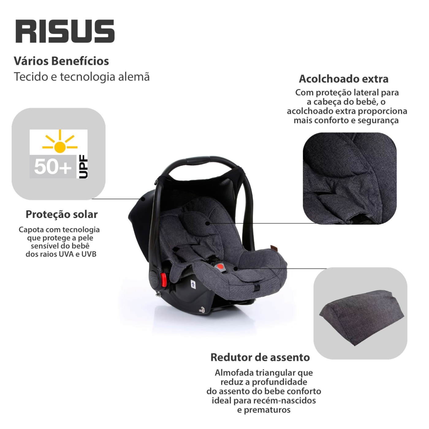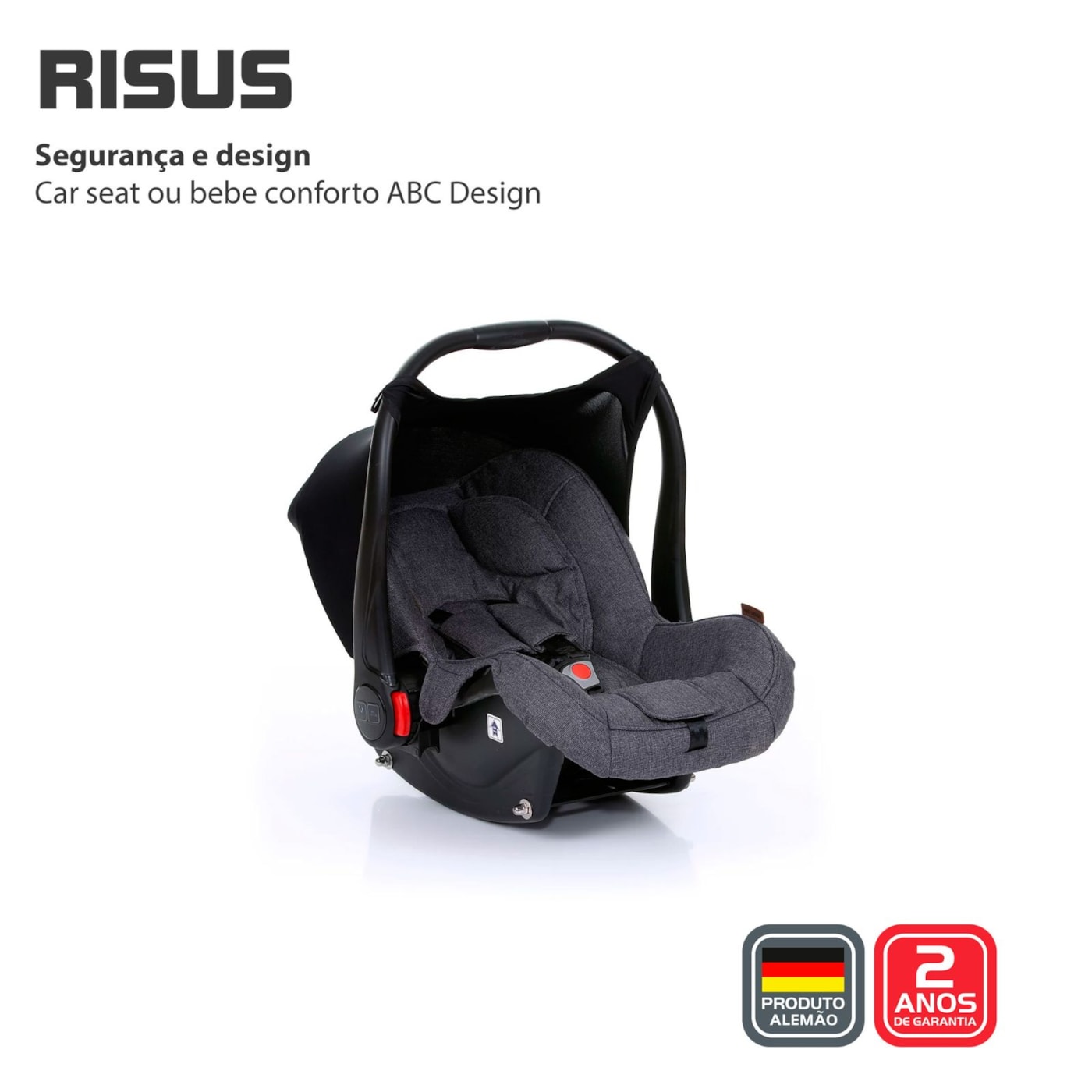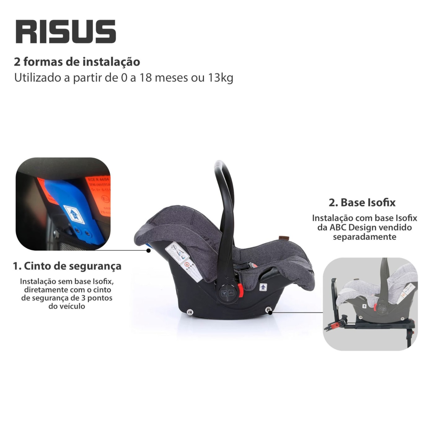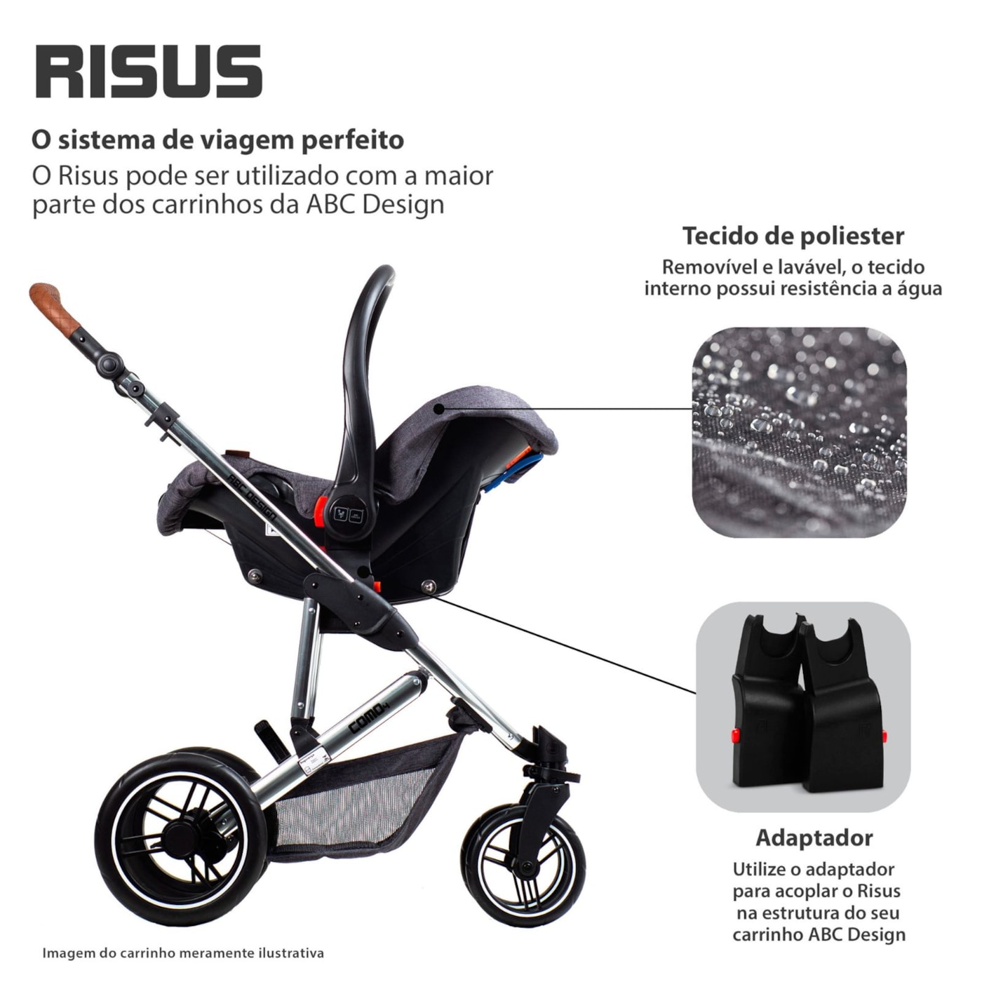 Travel System Compatível: Com o adaptador (vendido separadamente), o Risus é compatível com vários modelos de carrinhos da ABC Design, incluindo: 3tec, Salsa 3, Salsa 4, Condor 4, Mint, Okini, Merano 4, Avito, Como 4 e Zoom. Isso transforma o carrinho em um prático sistema Travel System.