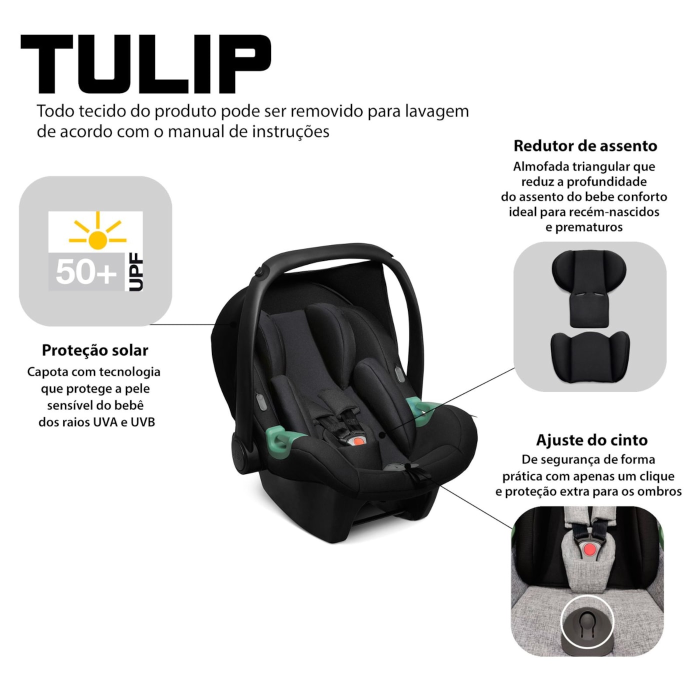 Transforme seu carrinho em um Travel System ao acoplar o Bebê Conforto Tulip aos modelos Ping Two, Samba, Salsa 3, Salsa 4, Treviso 3 e Zoom (adaptadores vendidos separadamente).