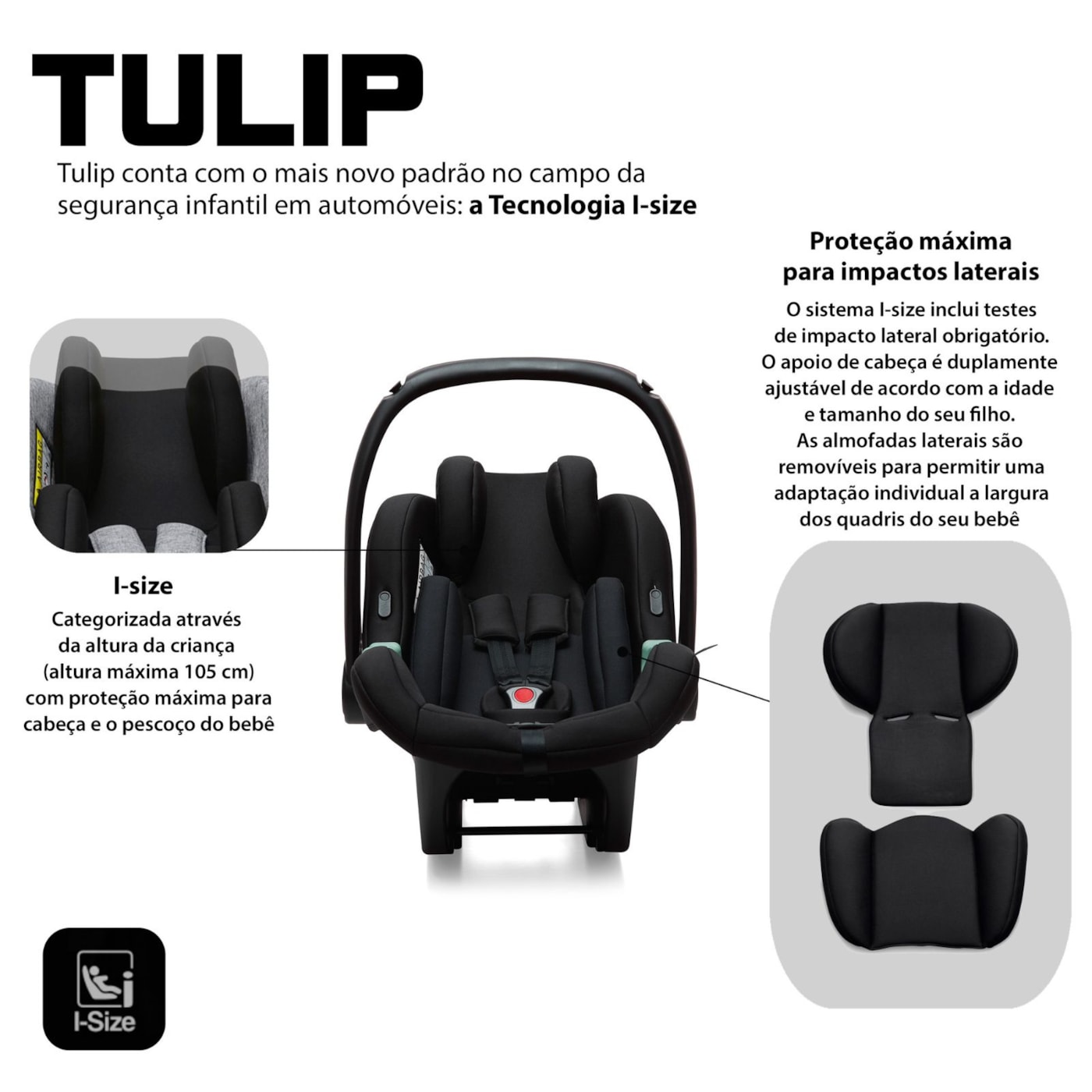 Certificado pelos rigorosos padrões internacionais de segurança, o Tulip utiliza a tecnologia I-Size, que considera a altura da criança para uma adequação perfeita. Proporciona proteção reforçada para a cabeça e o pescoço.