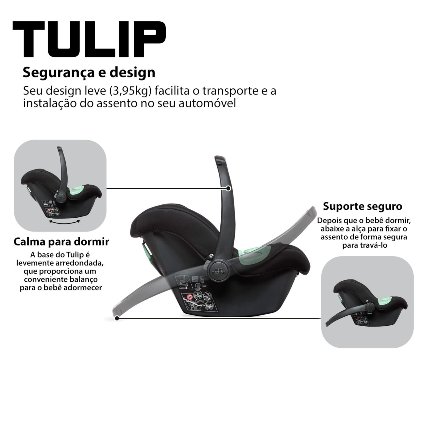 Com almofada de assento removível, apoio para cabeça ajustável e design leve, o Tulip proporciona conforto para o bebê e praticidade para os pais.
