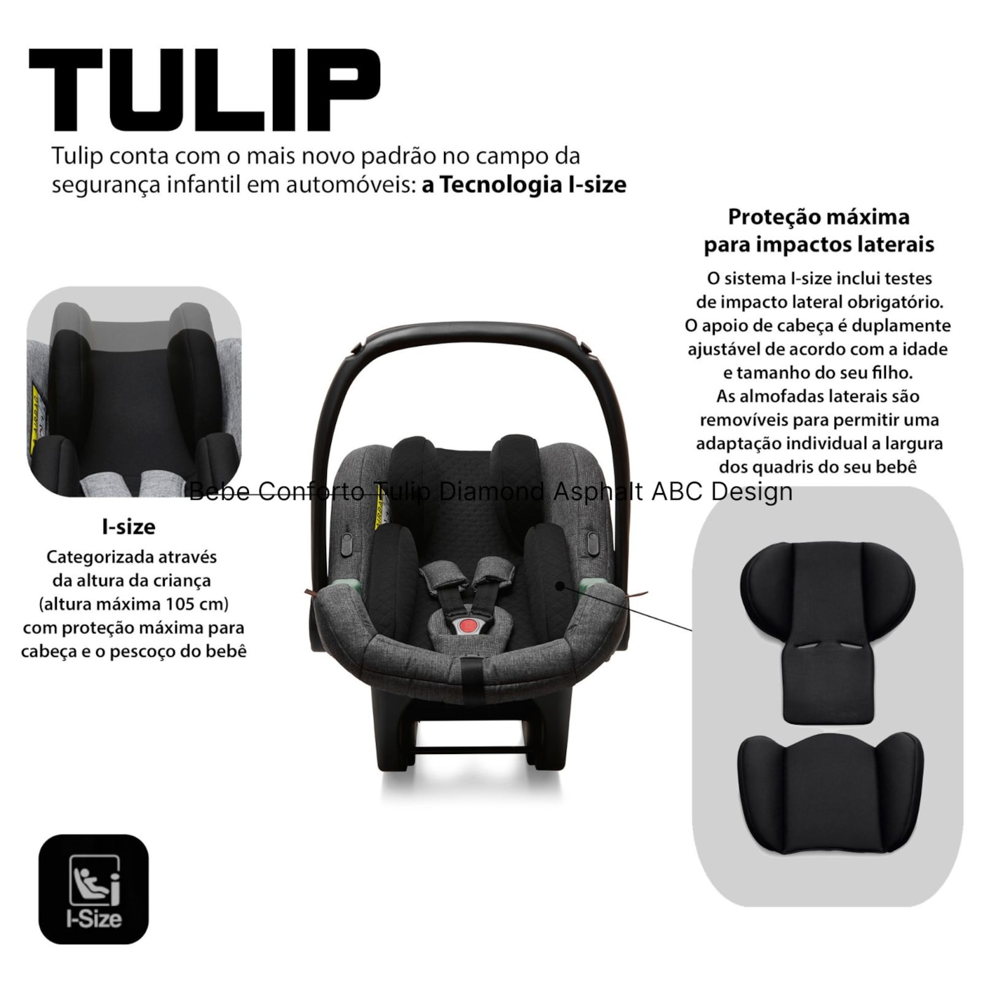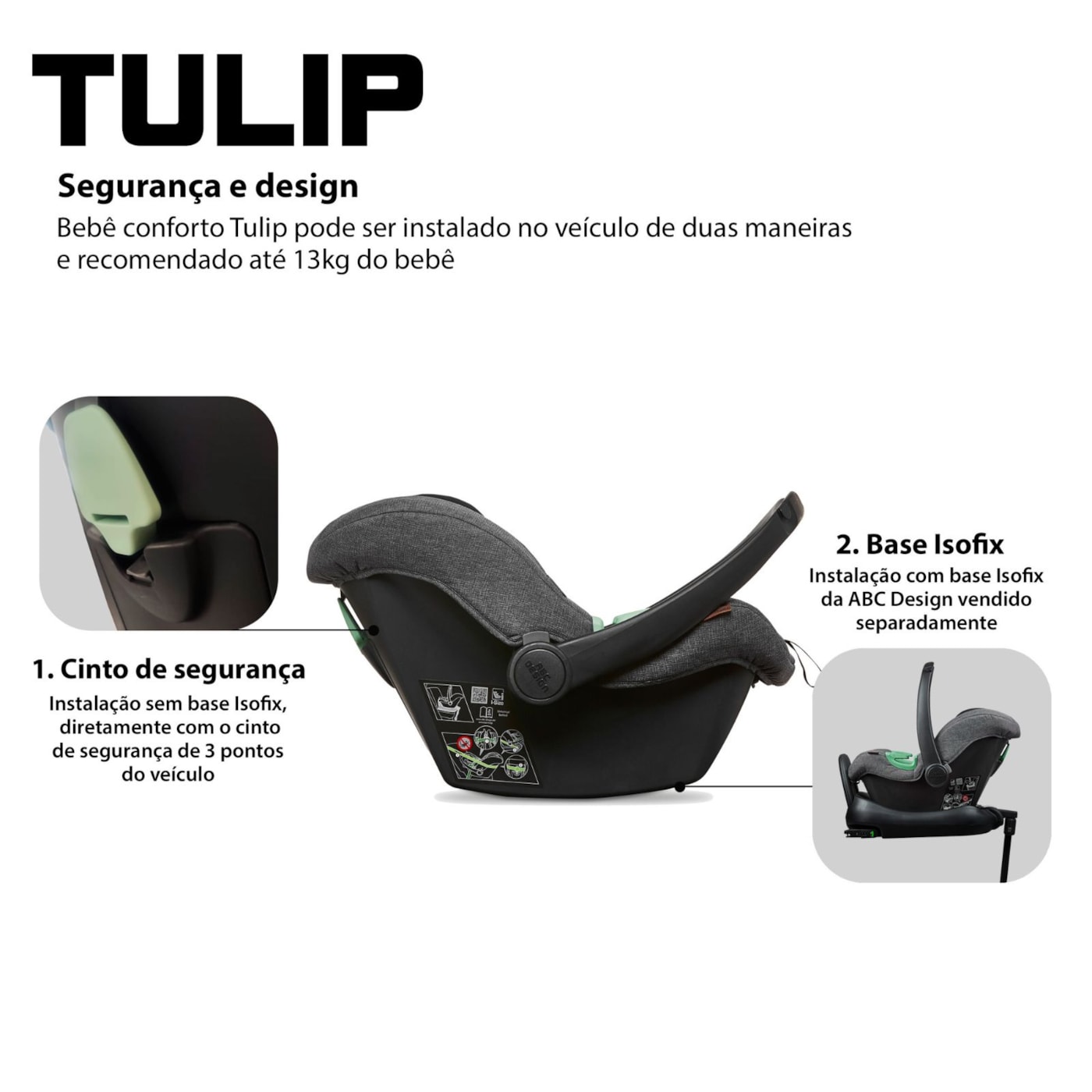 Base ISOFIX: Para instalação mais prática e segura, o Tulip pode ser acoplado na Base ISOFIX da ABC Design (vendida separadamente), compatível com veículos que possuem o sistema ISOFIX.