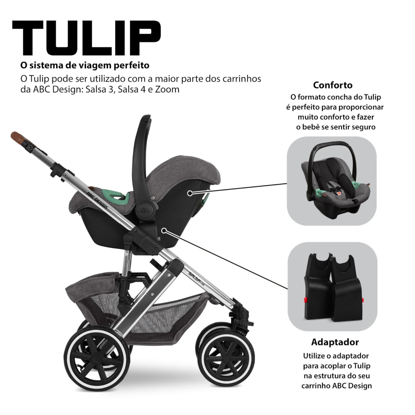 Compatível com os modelos de carrinhos ABC Design, como Salsa 3, Salsa 4, Zoom, Samba, Ping Two e Treviso 3, o Bebê Conforto Tulip pode ser acoplado (com adaptadores vendidos separadamente), transformando seu carrinho em um Travel System completo e versátil para o dia a dia.