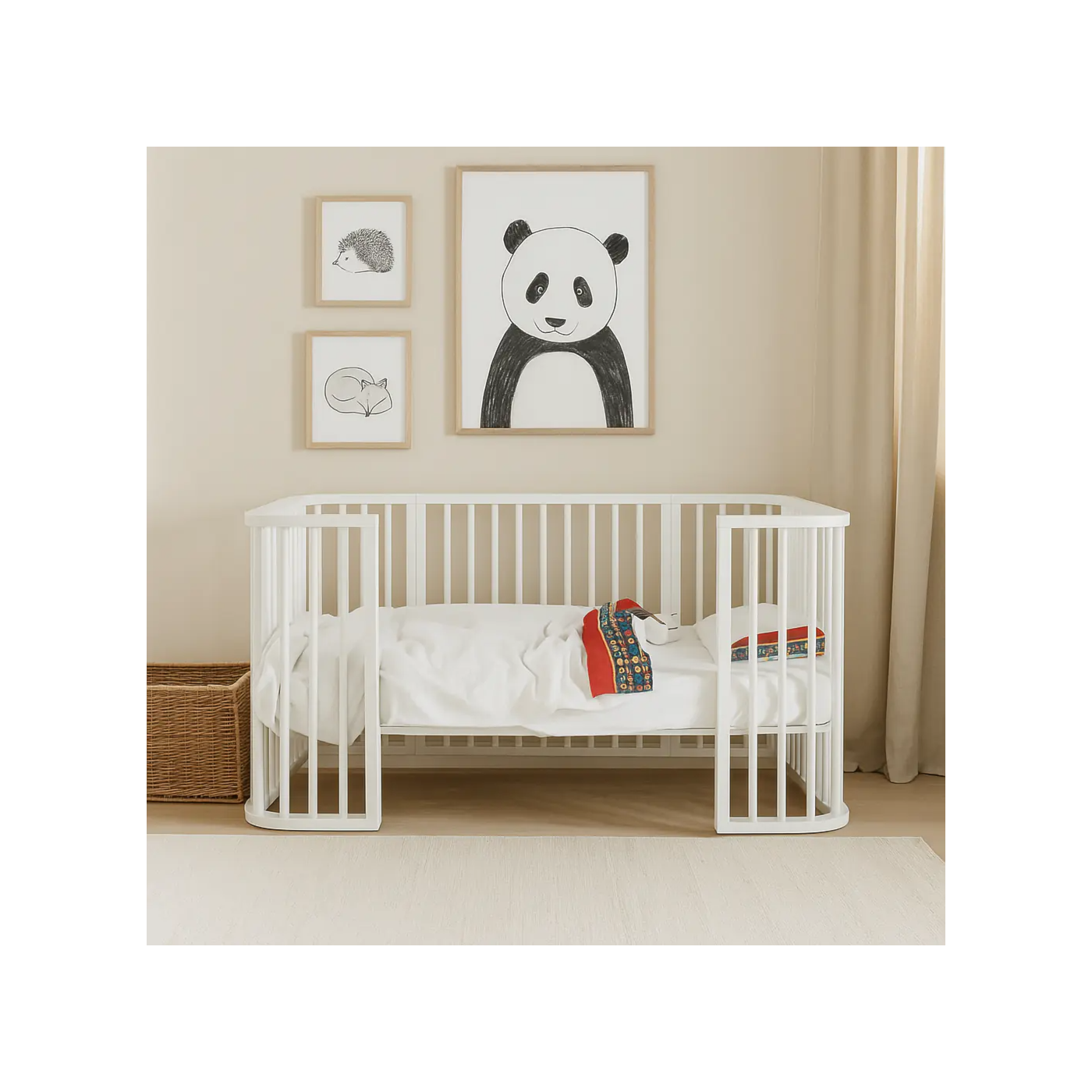 2ª fase – Berço Tamanho Tradicional: Com a adição de barras laterais, o espaço é ampliado, oferecendo mais conforto e liberdade para o bebê.
