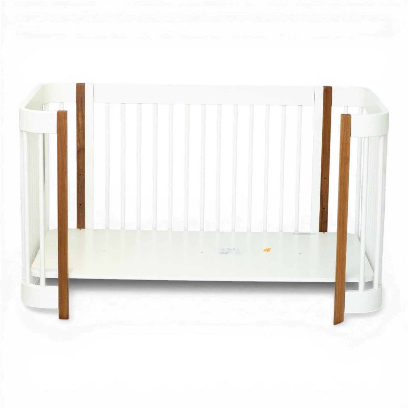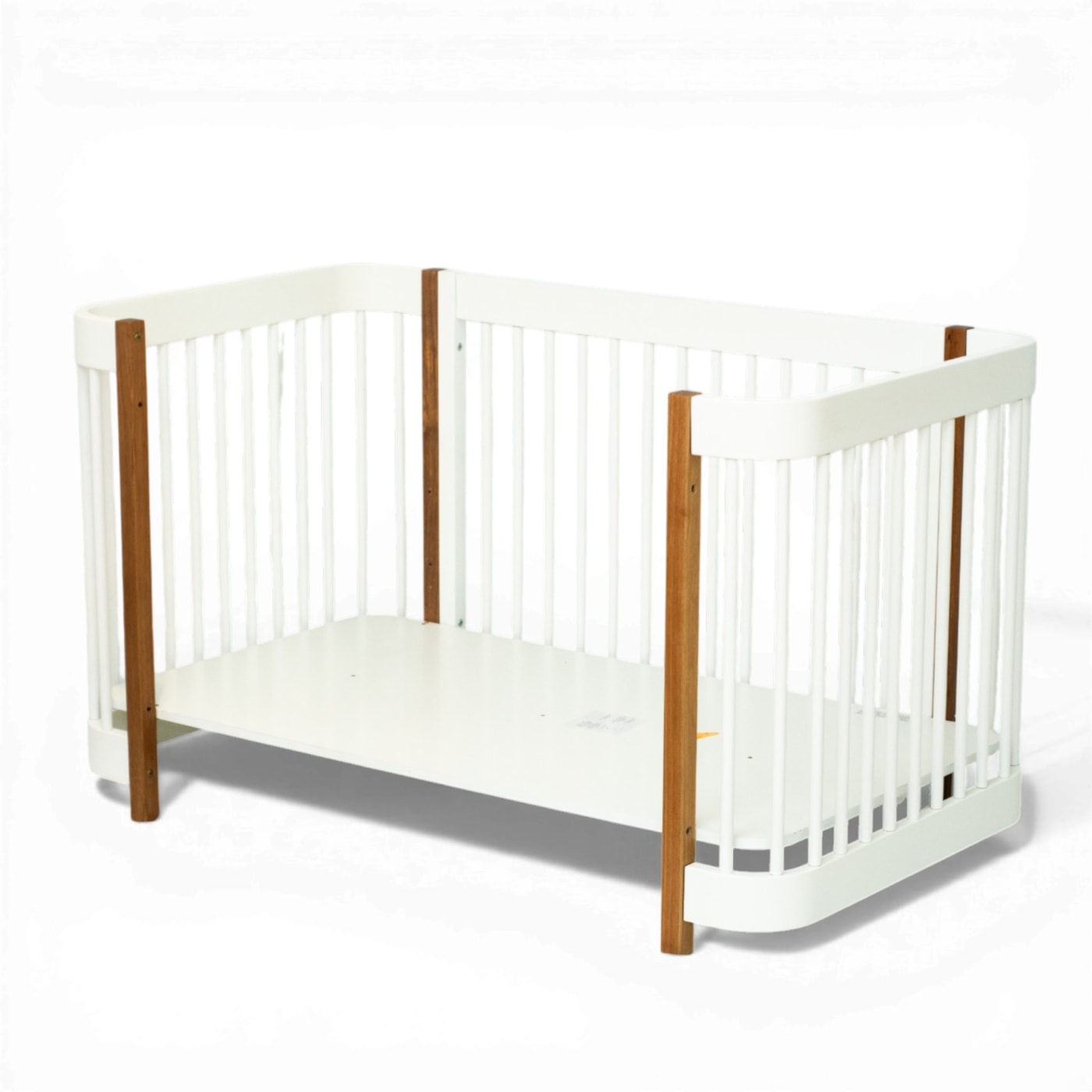 Berço fabricado 100% em madeira e produzido artesanalmente. As curvas são fabricadas em lâminas naturais prensadas e as demais partes são produzidas em madeira maciça de eucalipto e jequitibá, com pintura atóxica laqueada.