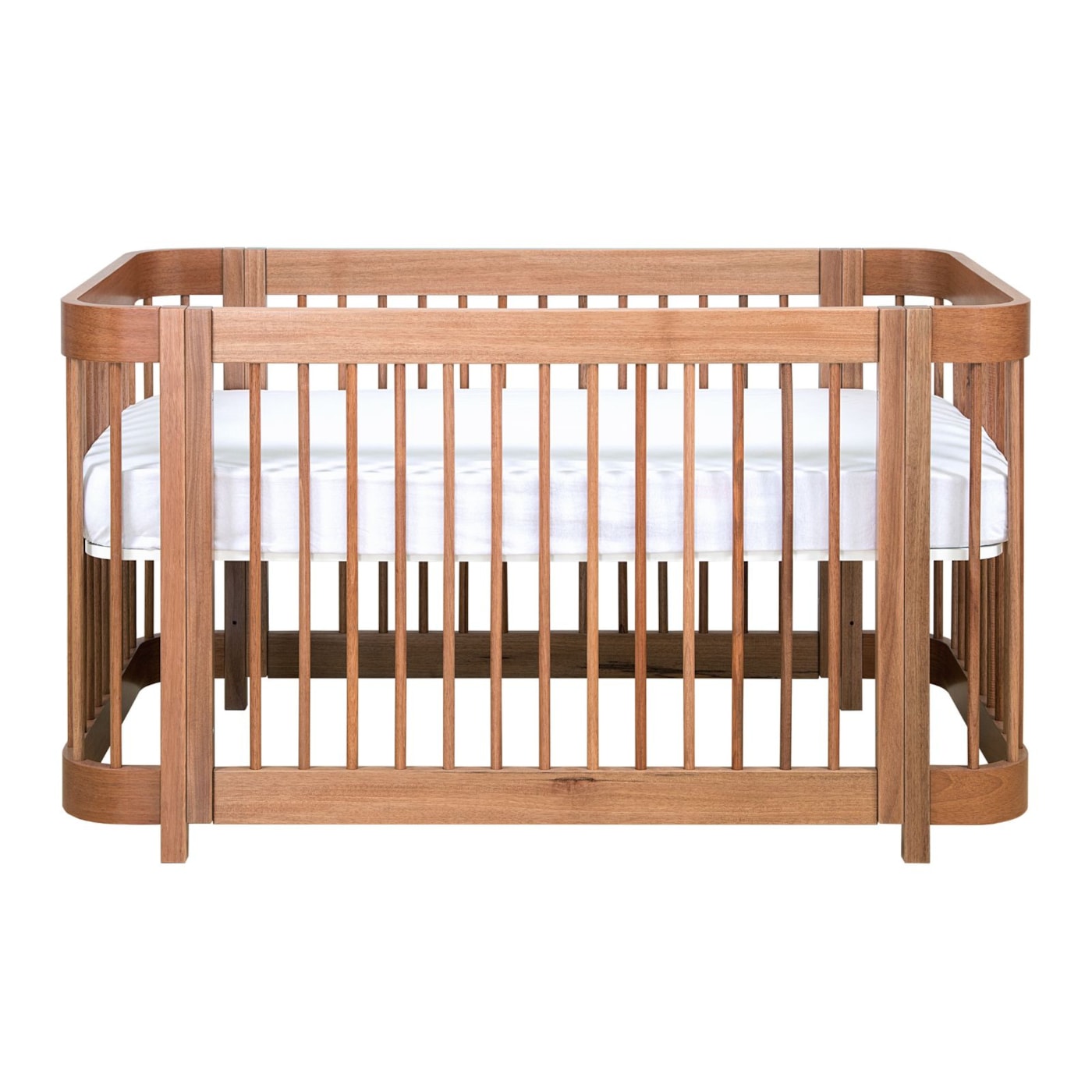 Berço fabricado 100% em madeira e produzido artesanalmente. As curvas são fabricadas em lâminas naturais prensadas e as demais partes são produzidas em madeira maciça de eucalipto e jequitibá, com pintura atóxica laqueada.