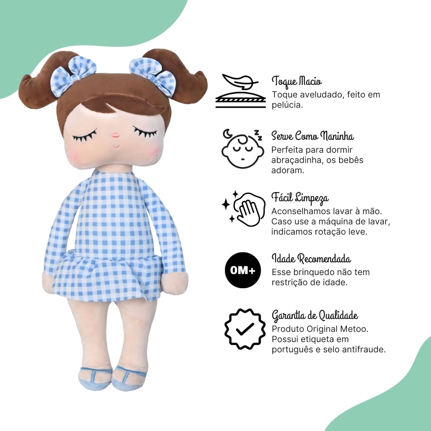 A Boneca Metoo Angela Malu está empolgada para aproveitar o calor. Desenvolvida exclusivamente para o Brasil, é indicada para crianças de todas as idades. Feita inteiramente em pelúcia, vem com maiô manga longa azul quadriculado e uma sandália de dedo super fofa! Os laços no cabelo com a mesma estampa do maiô dão todo um charme para a nossa Angela! Uma excelente opção para decorar ambientes infantis e presentear crianças e bebês. Perfeita para dormir abraçadinha, os bebês adoram. E o melhor: são colecionáveis. Não deixe de conferir os outros designs.