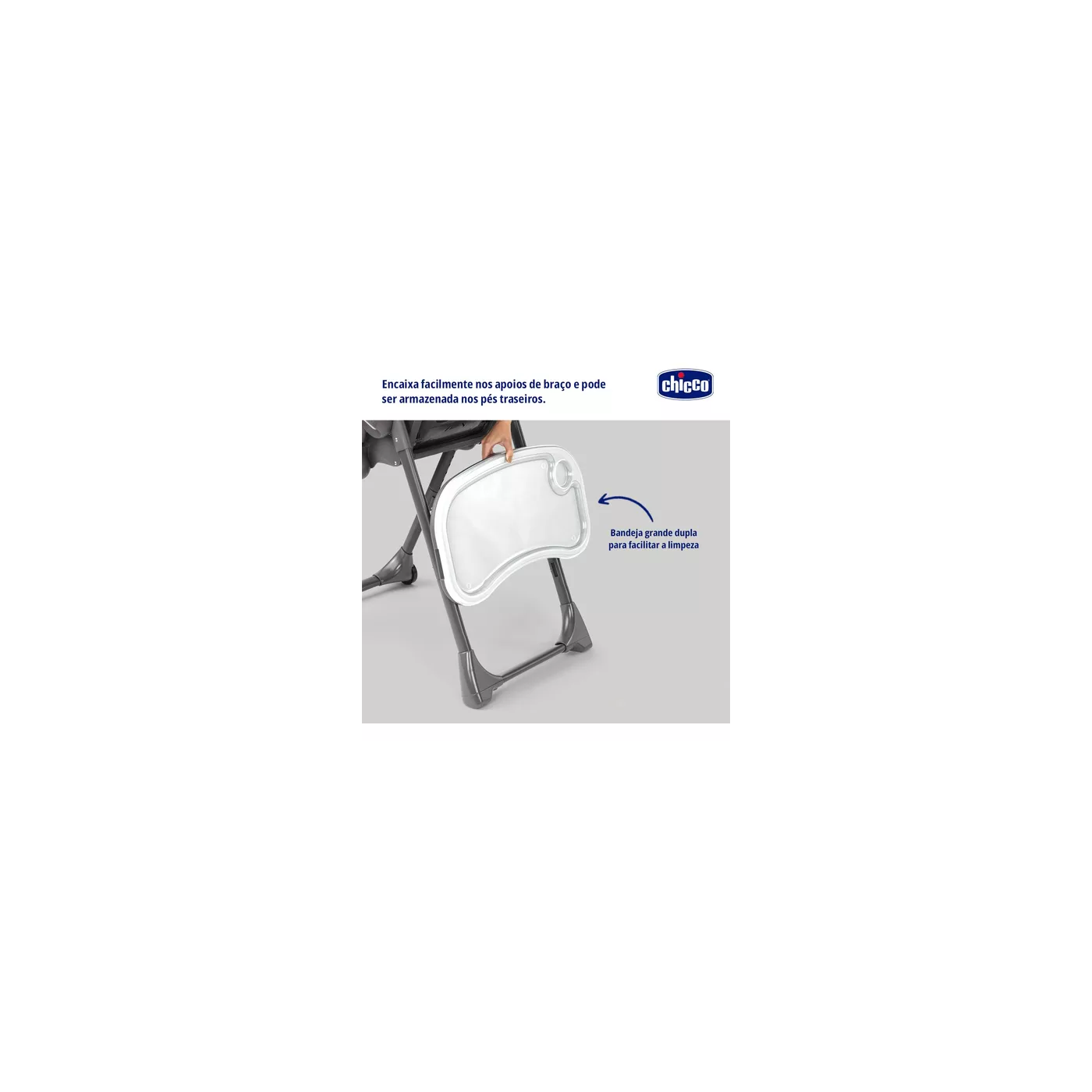 Bandeja dupla removível: Facilita a limpeza e pode ser armazenada nos pés traseiros da cadeira quando não está em uso.