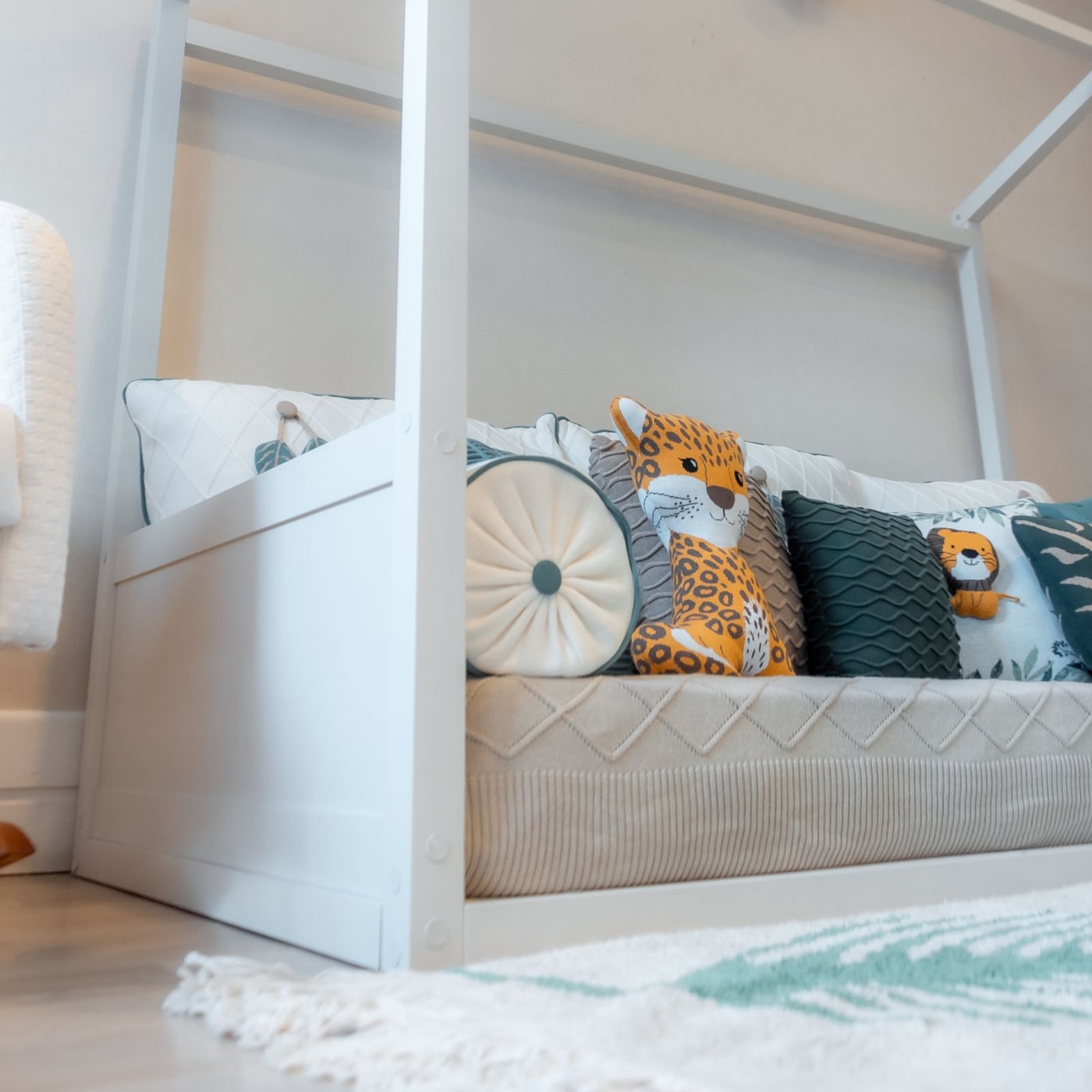 Com estrutura em formato de casinha lúdica, o móvel traz um ar acolhedor e divertido ao ambiente, além de possuir grade de proteção (90 cm de comprimento x 39 cm de altura), que garante maior segurança para o sono dos pequenos.
