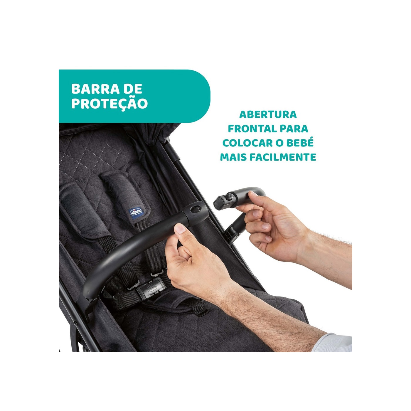 Barra de protecção com abertura frontal para colocar facilmente o bebé no banco. Quando o carrinho está dobrado, a barra do pára-choques pode ser utilizada para transportar o carrinho.