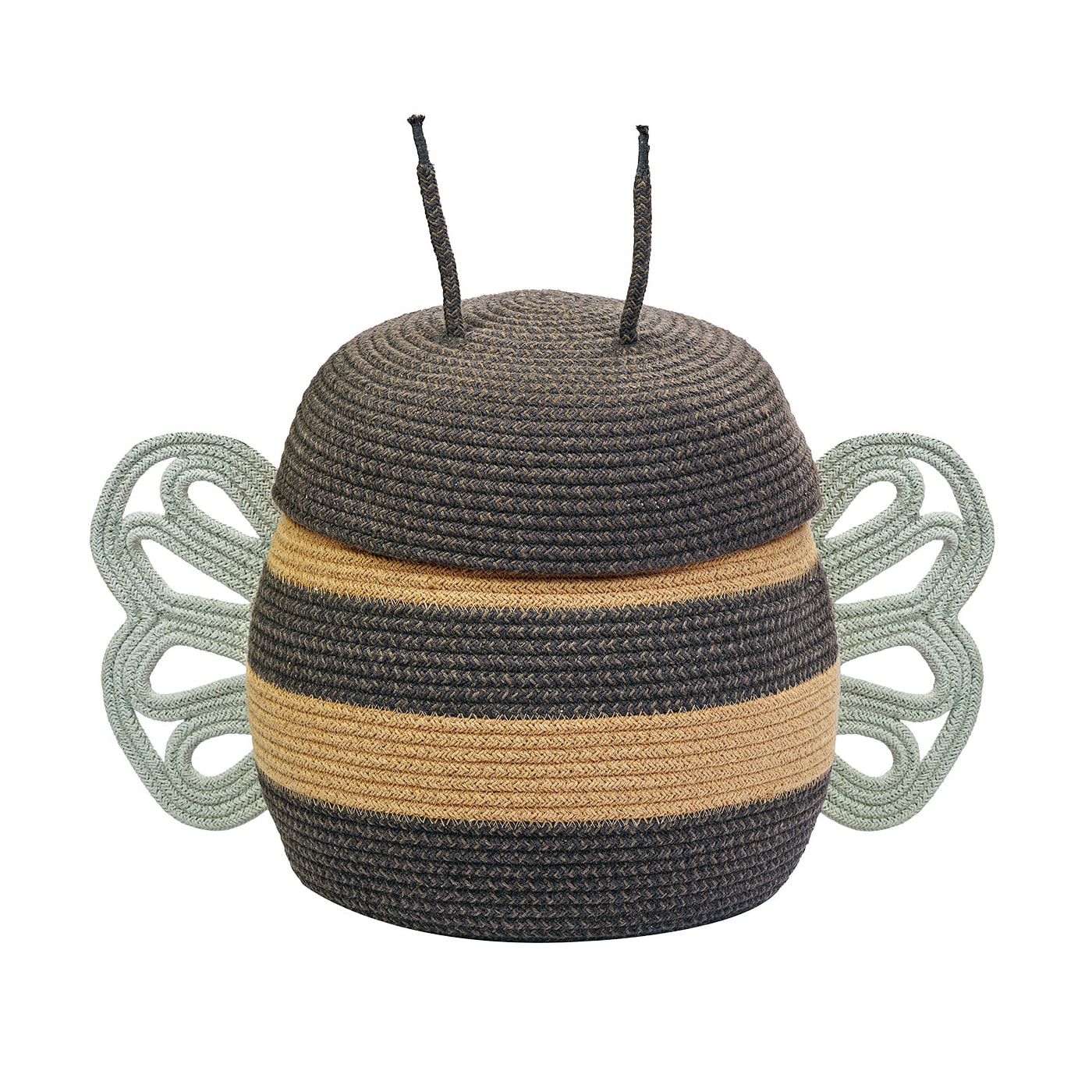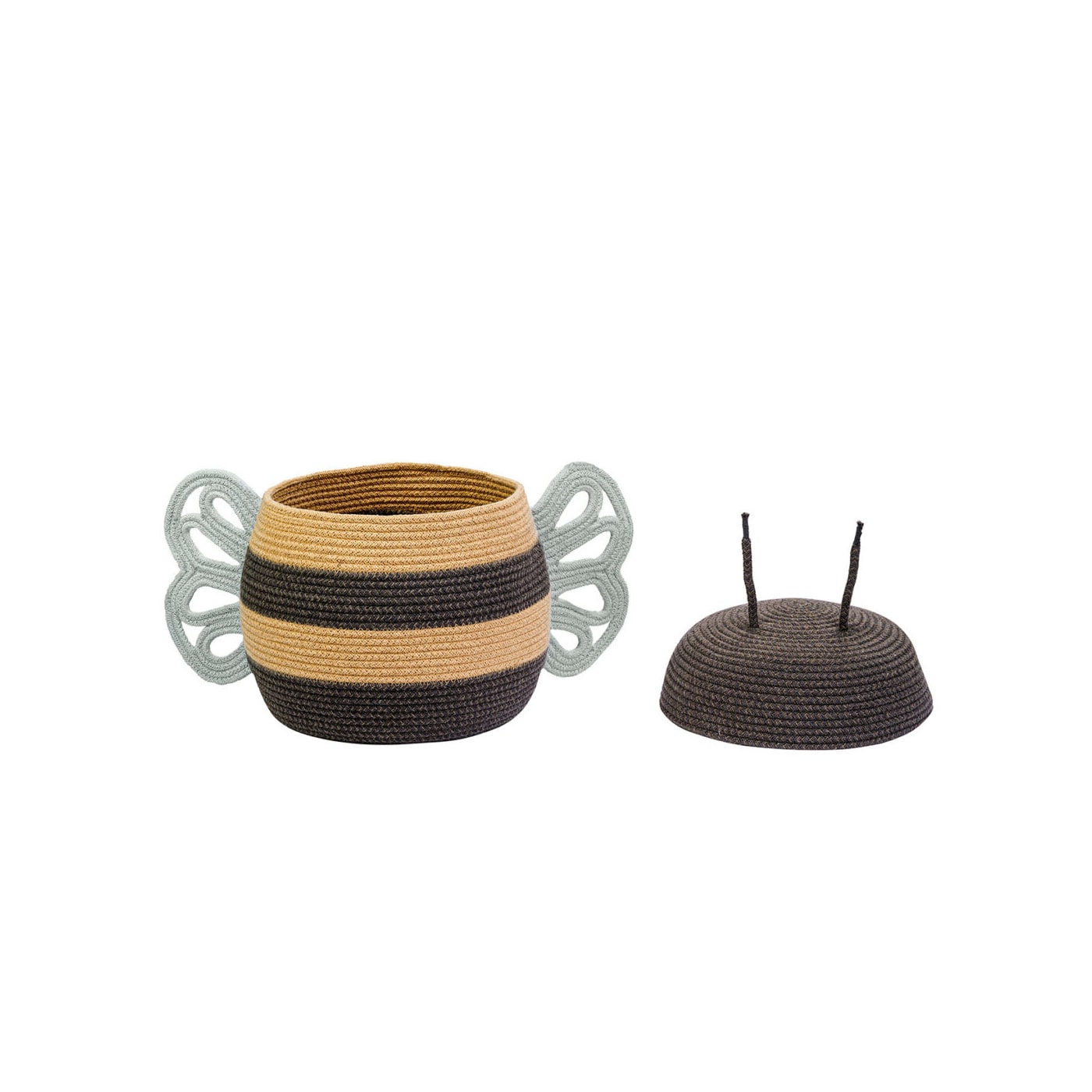 A cesta Mama Bee é feita artesanalmente com cordões trançados de garrafas PET recicladas e cobertos por fios de algodão, combinando a cor Mel com cordões mistos na cor cinza escuro. Com dois cordões como antenas e asas de formato delicado na cor azul claro, a cesta Mama Bee vai ajudar a manter brinquedos e pequenos tesouros organizados.