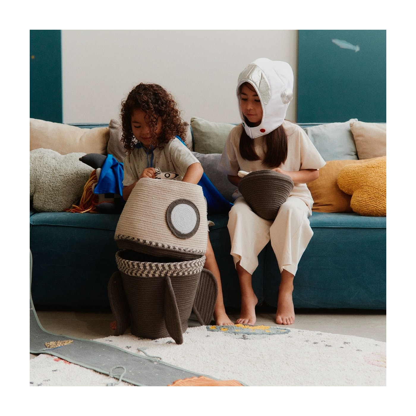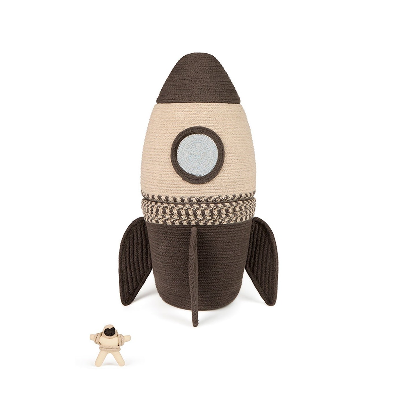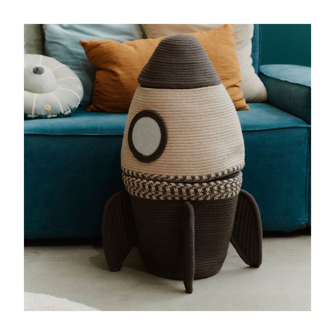 Apertem os cintos, porque estamos prestes a lançar no espaço sideral! O cesto Giant Rocket não é apenas uma cesta, mas três cestas separadas que se empilham para formar um foguete pronto para a decolagem. Cada camada é cuidadosamente confeccionada à mão com cordão de algodão trançado feito de algodão e fibras de garrafas PET recicladas, tornando-a mais resistente e com detalhes em cinza escuro, natural e azul claro.