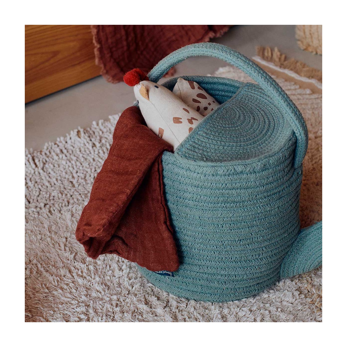 Cesto em formato de regador na cor azul vintage com detalhes em cordões de algodão simulando água.