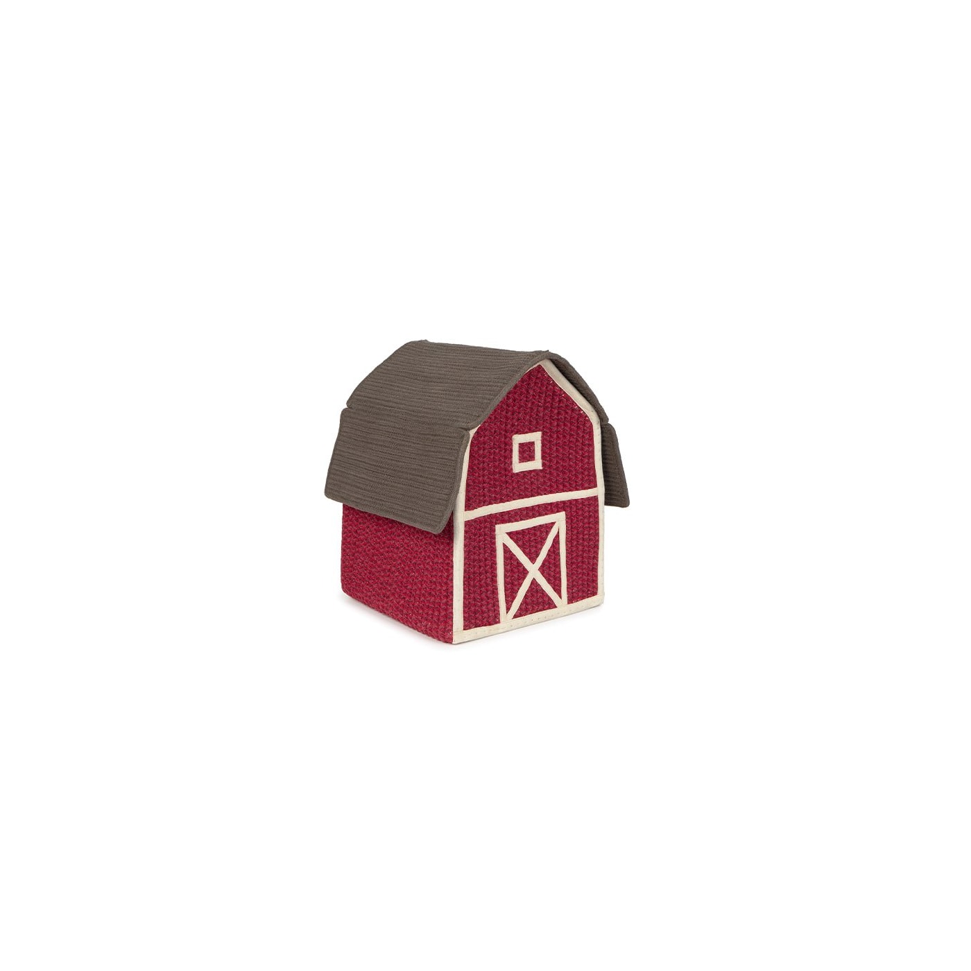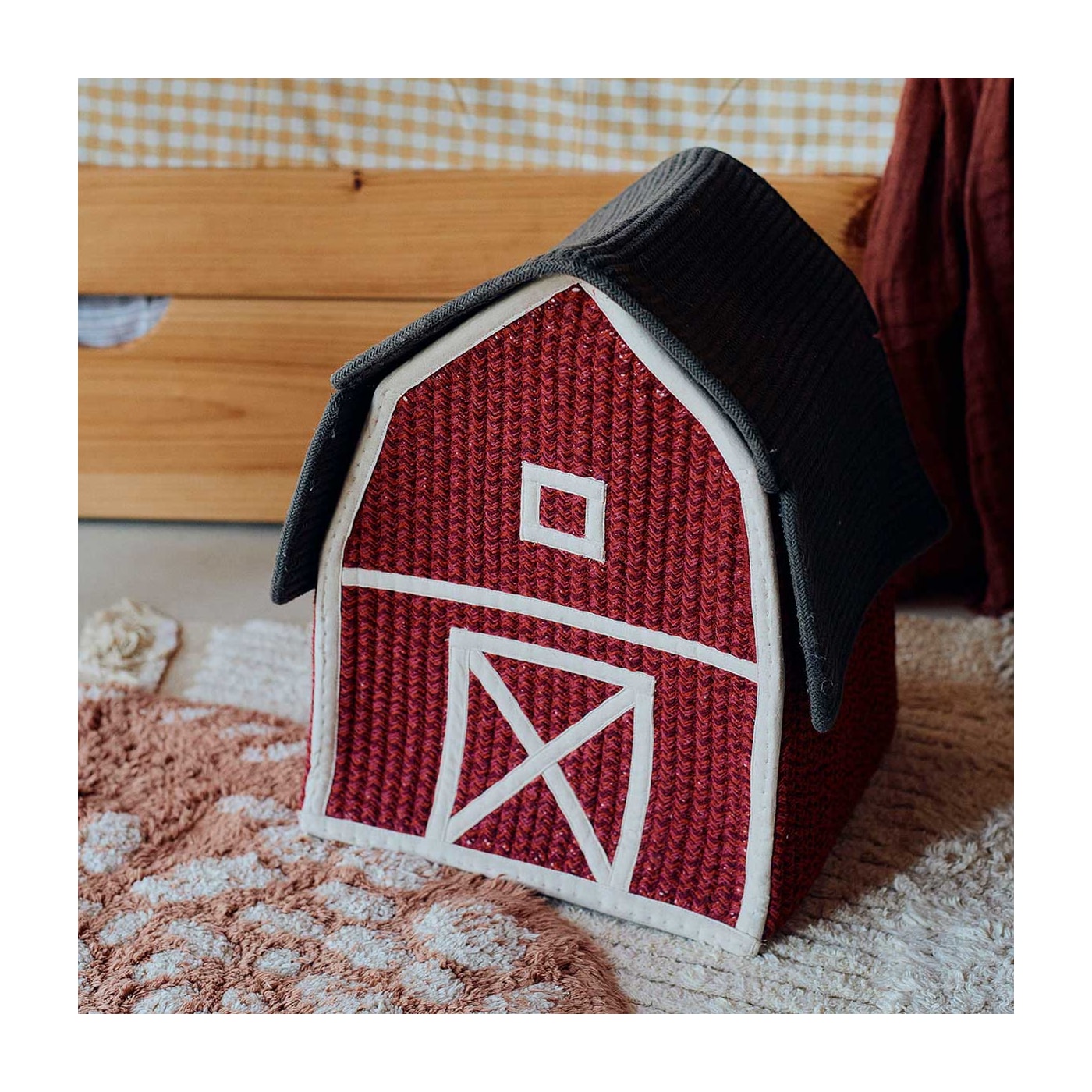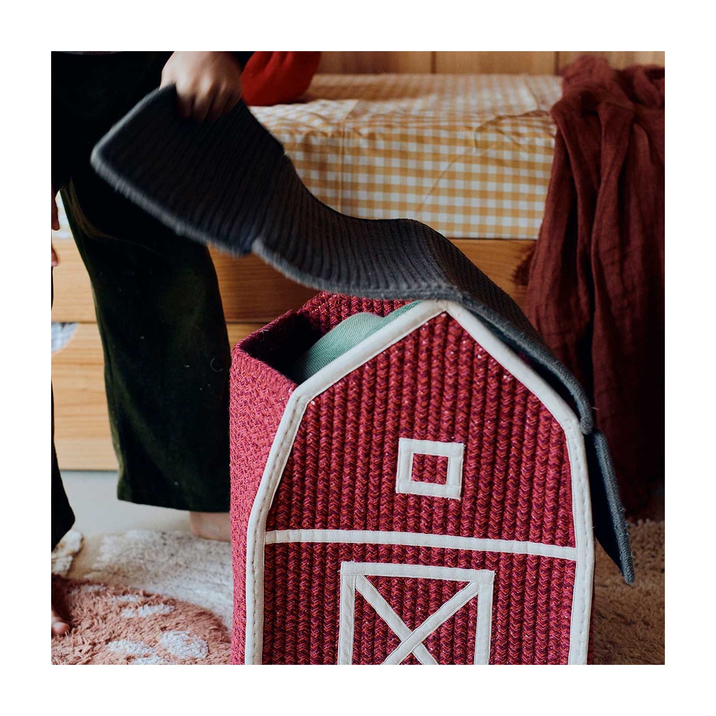 Cesto em formato de celeiro, na cor vermelho. Abre dos dois lados da tampa, que simula um telhado. É acabado com listras brancas em formato de janela e porta.