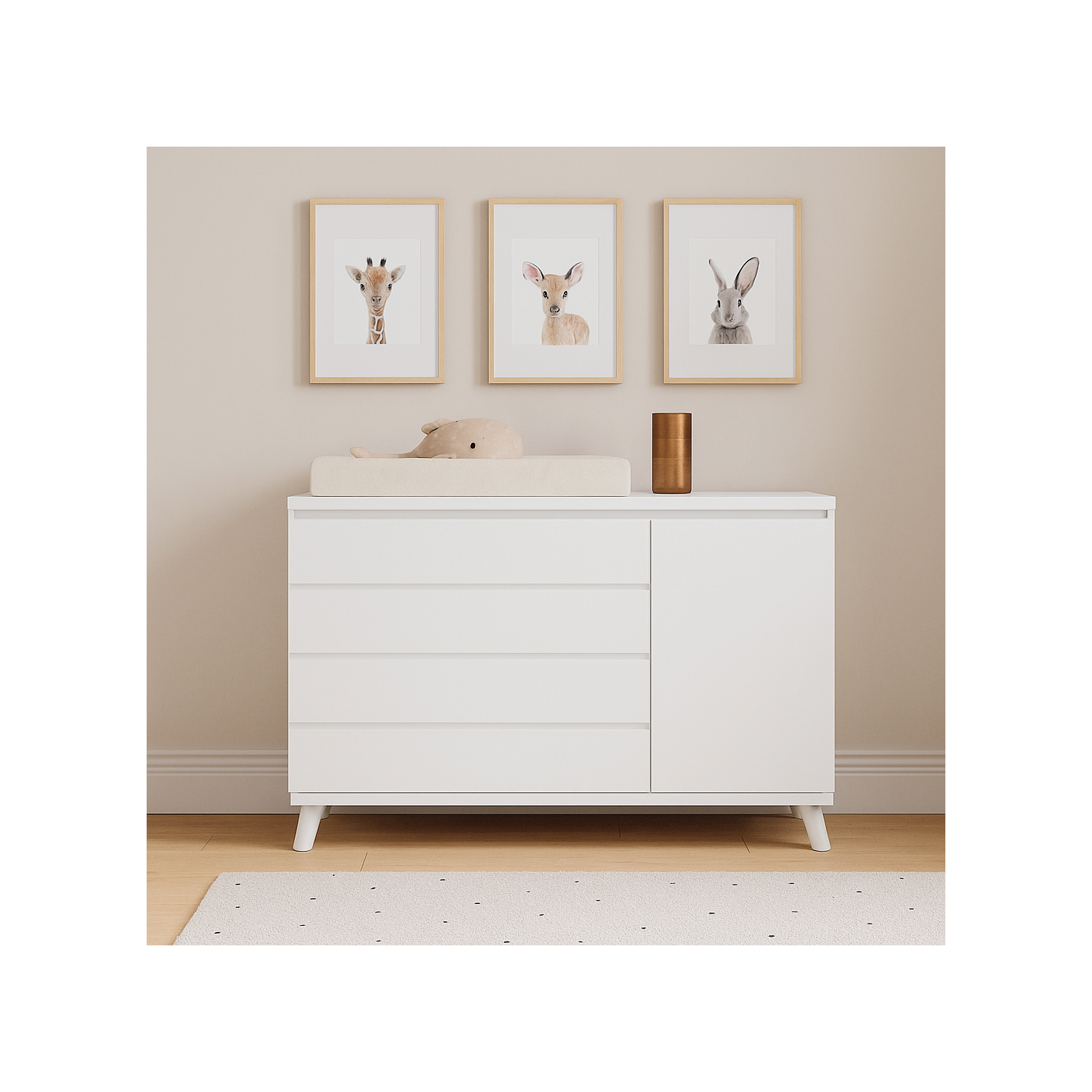 O puxador cava na porta proporciona uma abertura suave e sem esforço, enquanto as gavetas deslizantes facilitam o acesso aos itens armazenados. Além disso, a altura confortável da cômoda permite que tanto adultos quanto crianças usem a superfície como uma área para o trocador do bebê.