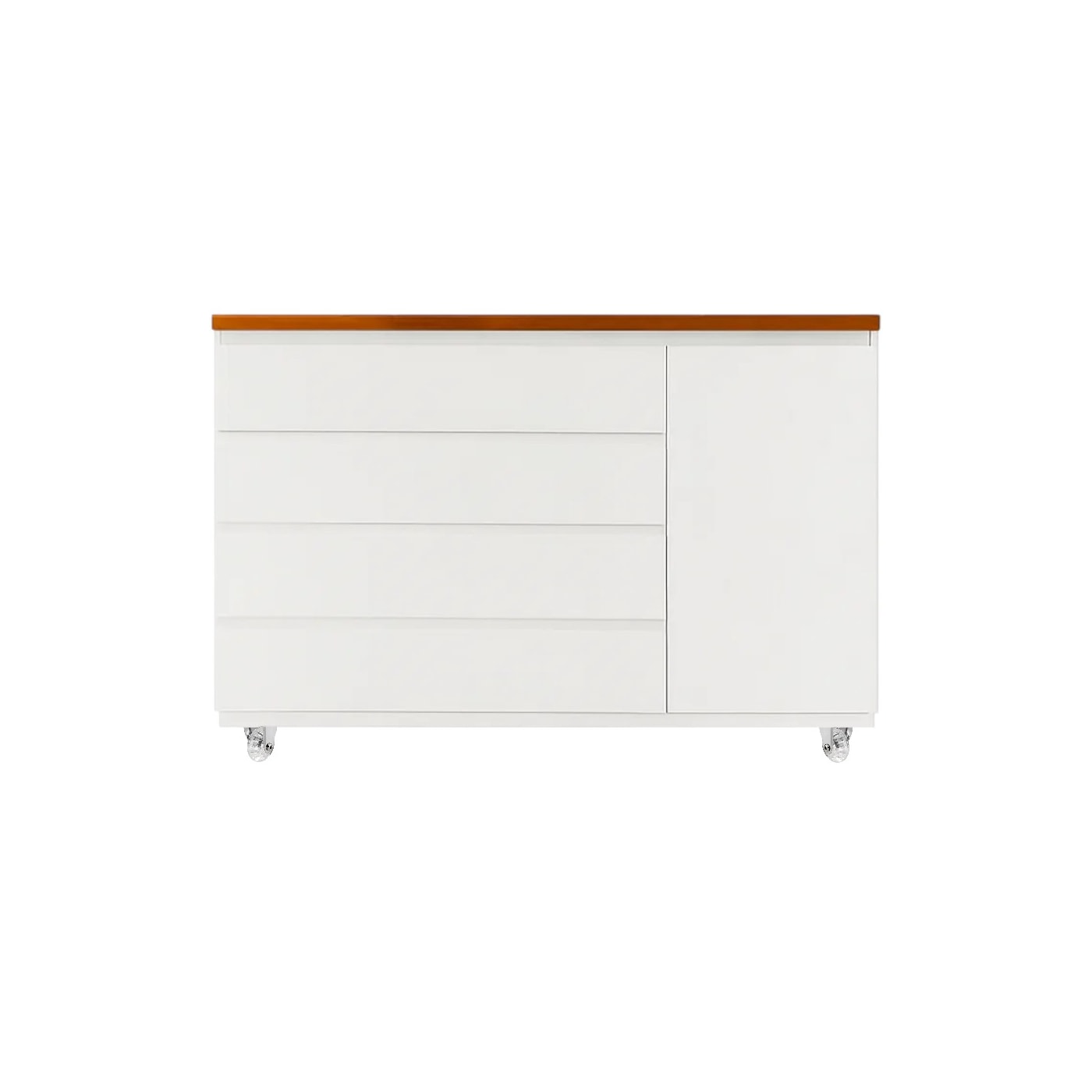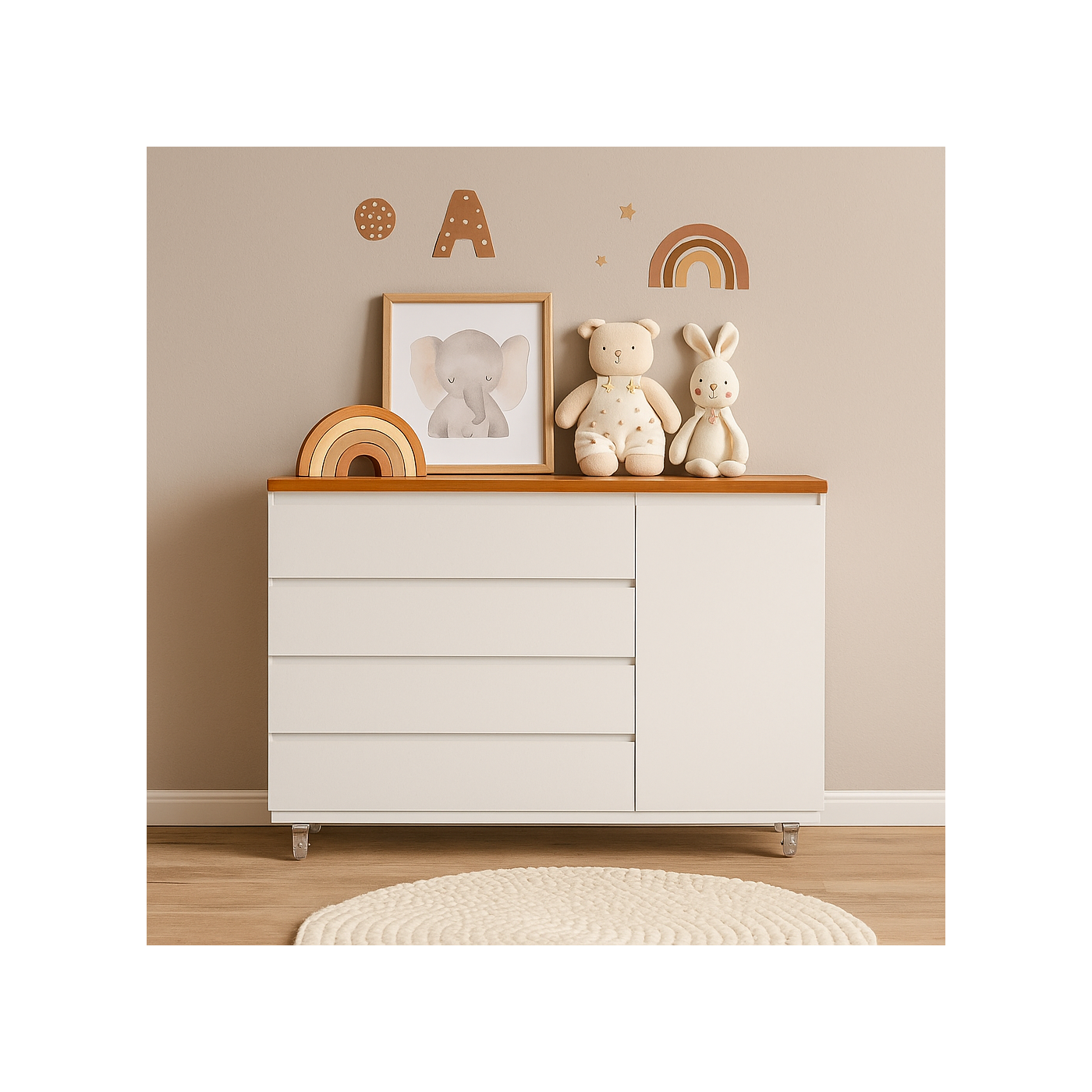 Cômoda Bada Branca com 4 Gavetas e 1 Porta com Rodízios Tampo Madeira - Kartoon
