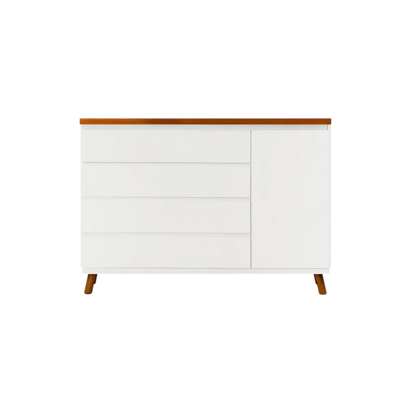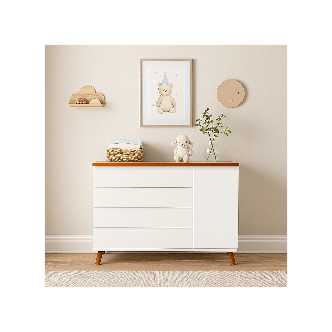 Possui um design funcional com quatro gavetas espaçosas e uma porta com puxador cava, a Cômoda Badá oferece amplo espaço de armazenamento para todas as necessidades do seu filho, mantendo o ambiente organizado e livre de bagunça.