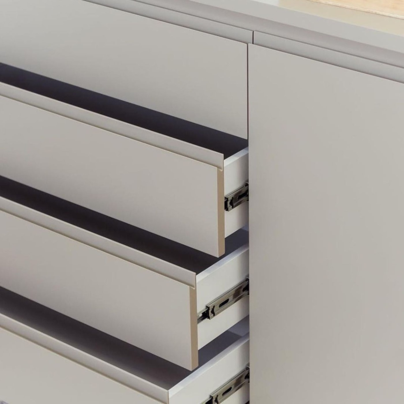 O puxador cava na porta proporciona uma abertura suave e sem esforço, enquanto as gavetas deslizantes facilitam o acesso aos itens armazenados. Além disso, a altura confortável da cômoda permite que tanto adultos quanto crianças usem a superfície como uma área para o trocador do bebê.