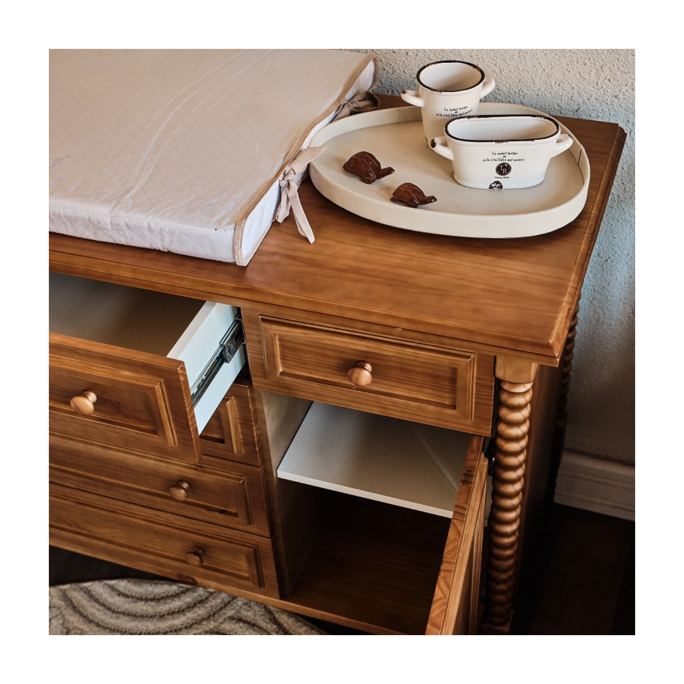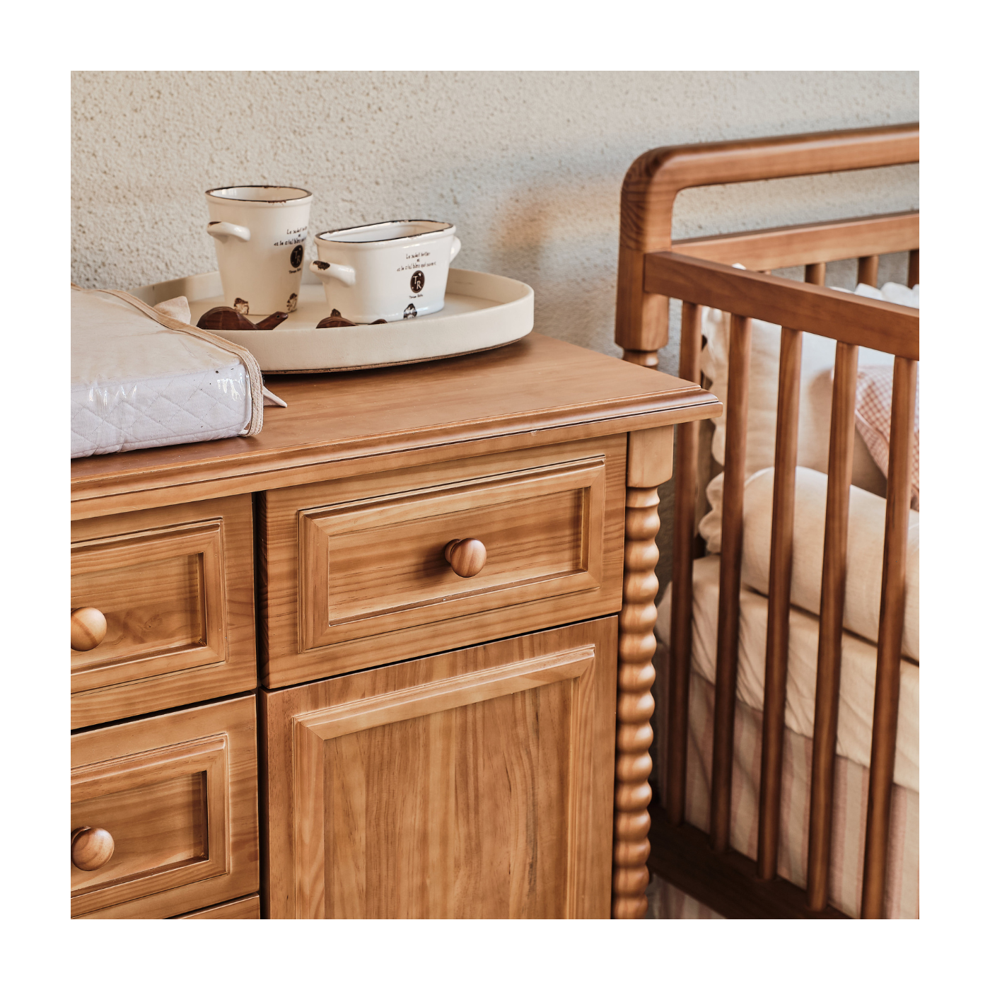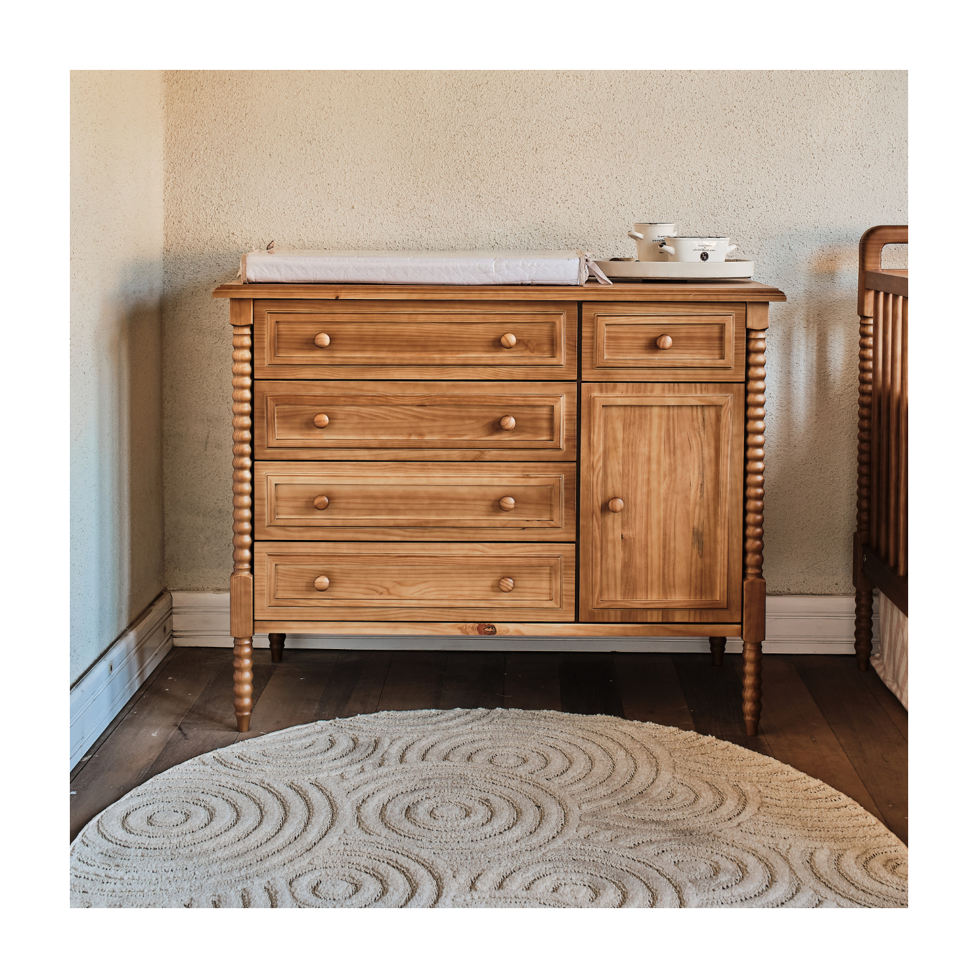 Produzida em madeira maciça e com acabamento artesanal, cada detalhe é pensado para garantir durabilidade, beleza natural e um toque atemporal. O conjunto de gavetas amplas facilita a organização das roupas e acessórios do bebê no dia a dia, mantendo tudo sempre à mão.