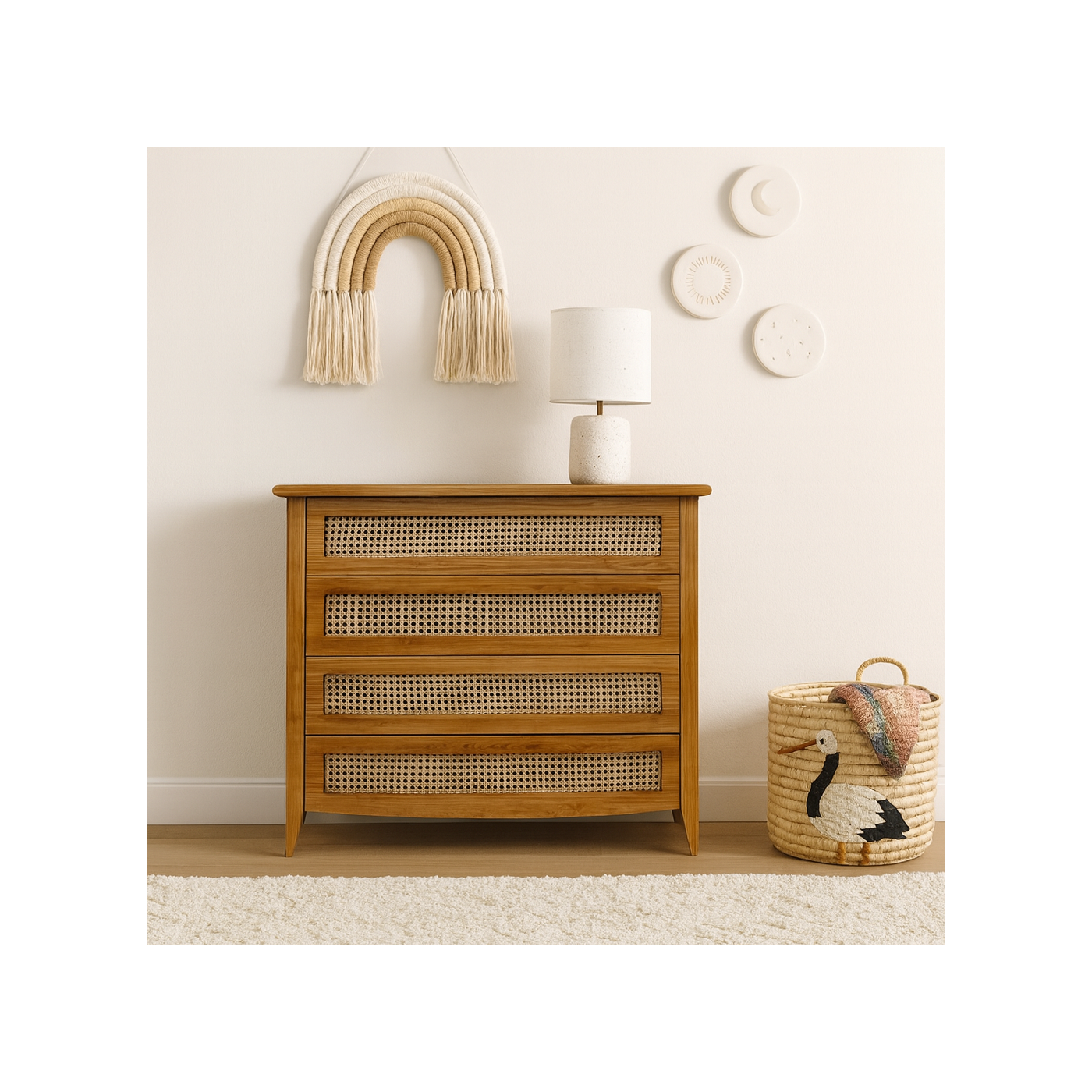 A Cômoda Little Plus Mel – Stillen combina tecnologia, sofisticação e estética natural para compor quartos infantis elegantes e funcionais. Seu design contemporâneo é valorizado pela frente das gavetas em palha sextavada natural, que traz leveza visual, ventilação e um toque artesanal refinado ao ambiente.