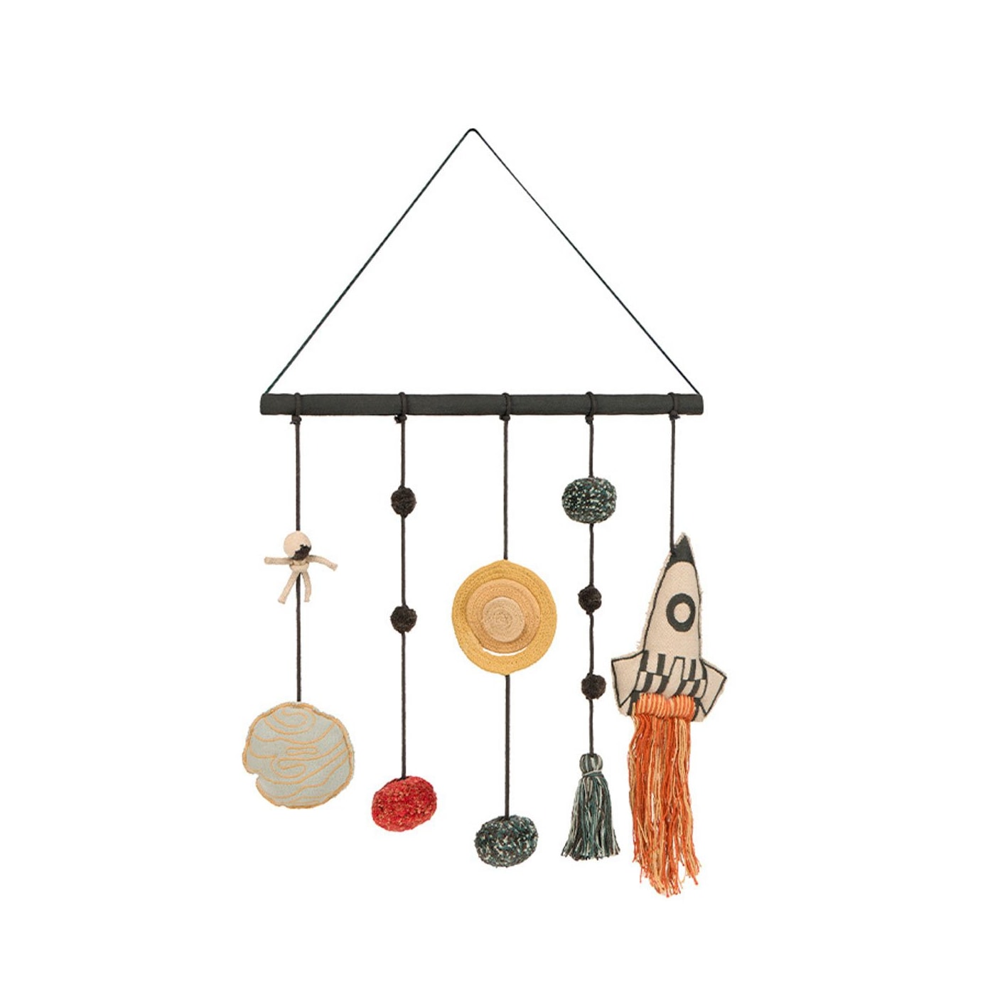 Introduza uma aventura cósmica em qualquer ambiente com o enfeite de parede Cosmos. Esta decoração de parede feita à mão apresenta um astronauta encantador feito de corda, órbitas divertidas feitas de cordas de algodão, planetas têxteis com franjas longas e detalhes coloridos por toda parte.