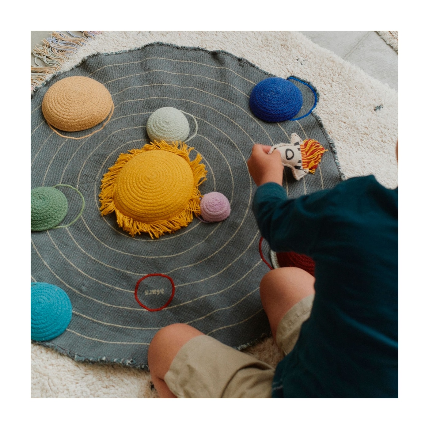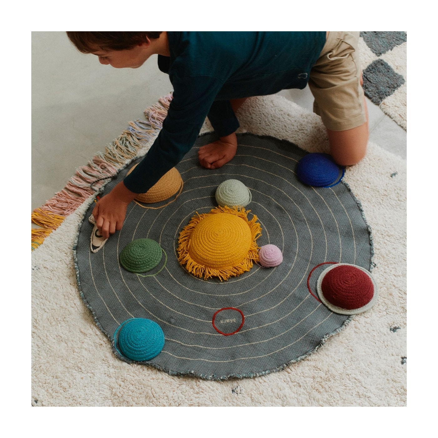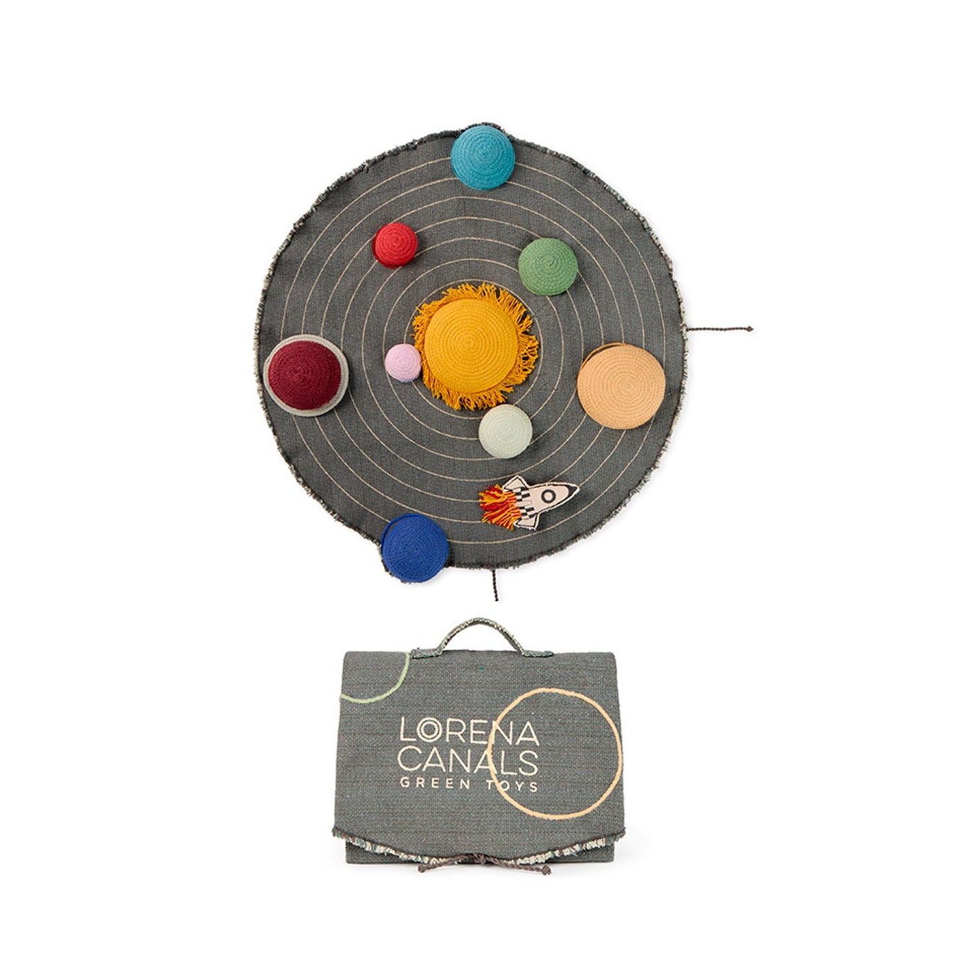 A tela cinza escuro e petróleo vem com uma impressão natural de órbitas planetárias, com planetas bordados em cores vibrantes. O conjunto inclui planetas de cordão de algodão trançado que podem ser colocados em suas órbitas corretas e um minifoguete têxtil para diversão extra enquanto as crianças viajam de um planeta para outro.