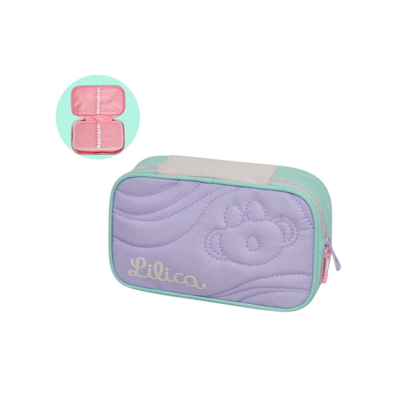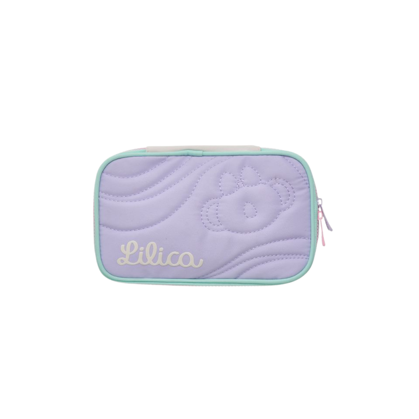 Com visual em blocos de cores nos tons de lilás e menta, o estojo apresenta uma estética moderna e delicada. O painel acolchoado em matelassê com o rosto da Lilica bordado e a escrita da marca em destaque agregam textura e identidade exclusiva à peça.