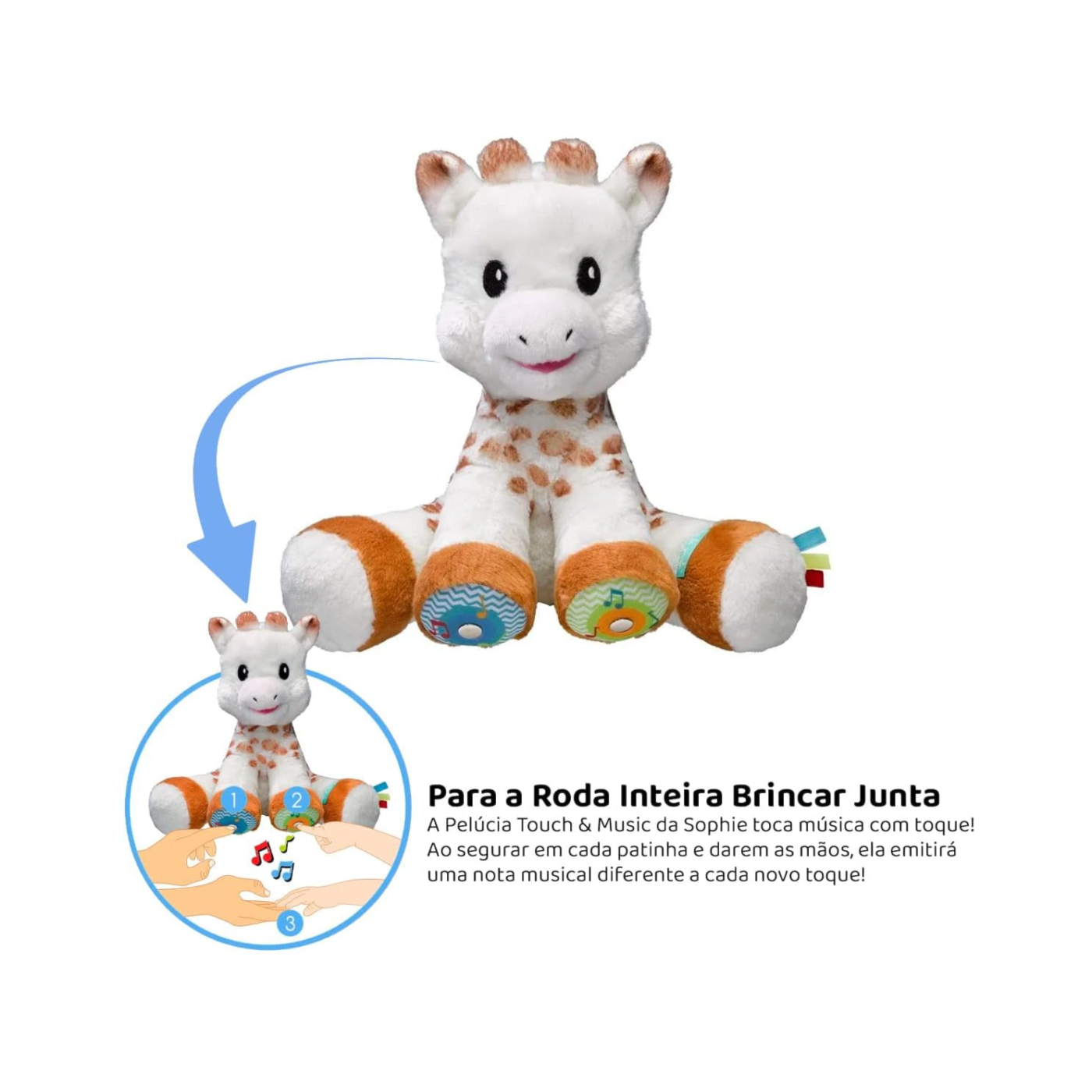 Esta pelúcia é perfeita para criar momentos incríveis entre o bebê e a família! Basta tocar os dois sensores das patinhas da Sophie simultaneamente com os dedos, mãos, pés ou nariz para ativar uma nota musical. A cada novo contato dos dois sensores com a pele, novas notas musicais são criadas para tocar uma melodia. Este brinquedo sensorial e musical é entretenimento para toda a família.– Certificação INMETRO: CE-BRI/SGS-0409-72– Dimensões: 27cm comprimento x 27cm altura x 21 cm espessura– Materiais: fibra sintética e componentes eletrônicos– Faixa etária indicativa: 3m+– Este produto não tem restrição de faixa etária