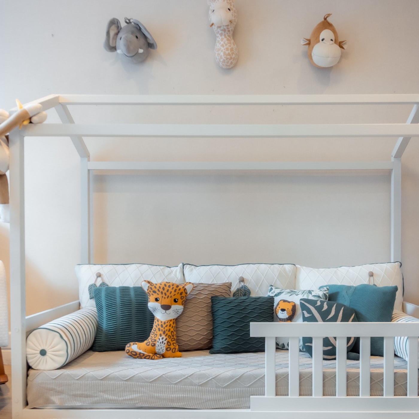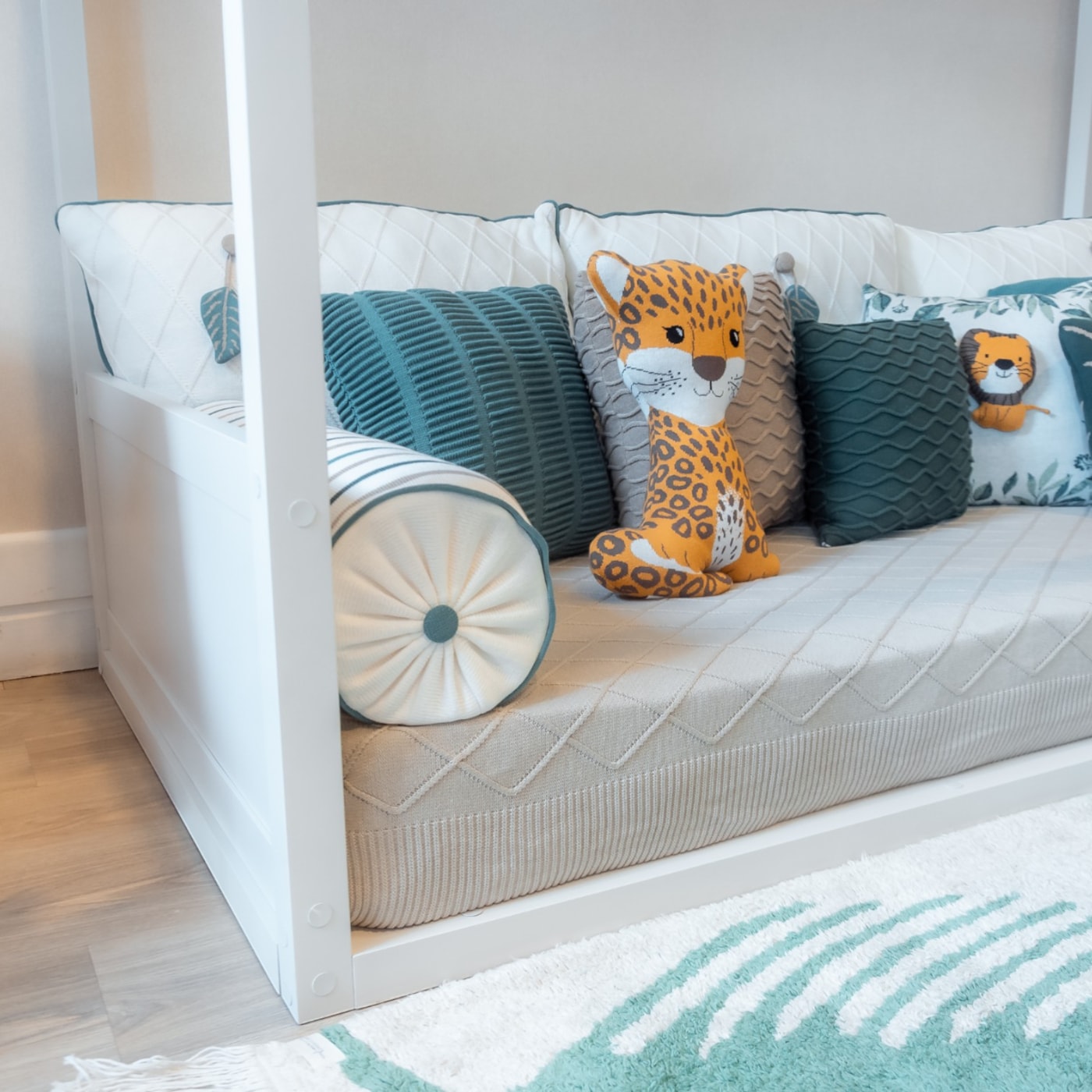 - Almofadas lúdicas em formato de folha e tigre, que enriquecem a decoração do quarto infantil