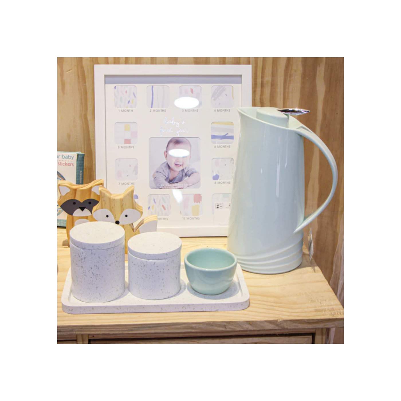 O kit possui efeito em granilite, uma tendência atemporal resgatada dos anos 40 e reinterpretada com novas cores e um design moderno, nosso kit é uma escolha perfeita para pais que buscam tanto praticidade quanto estilo na decoração do quarto do bebê.