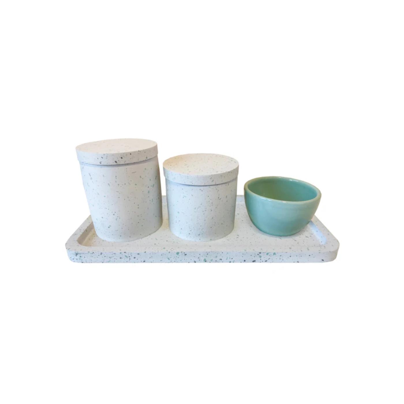 1 Bandeja, 1 pote para algodão, 1 pote para cotonete e 1 bowl de porcelana.