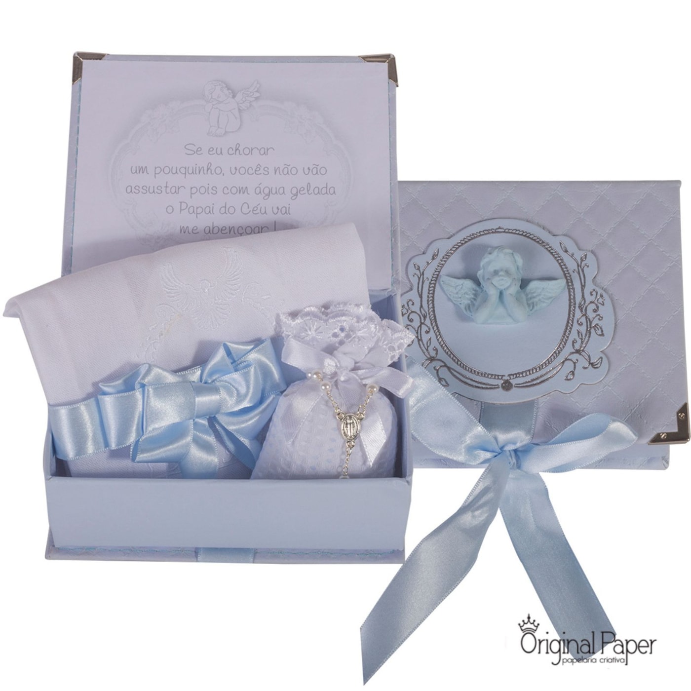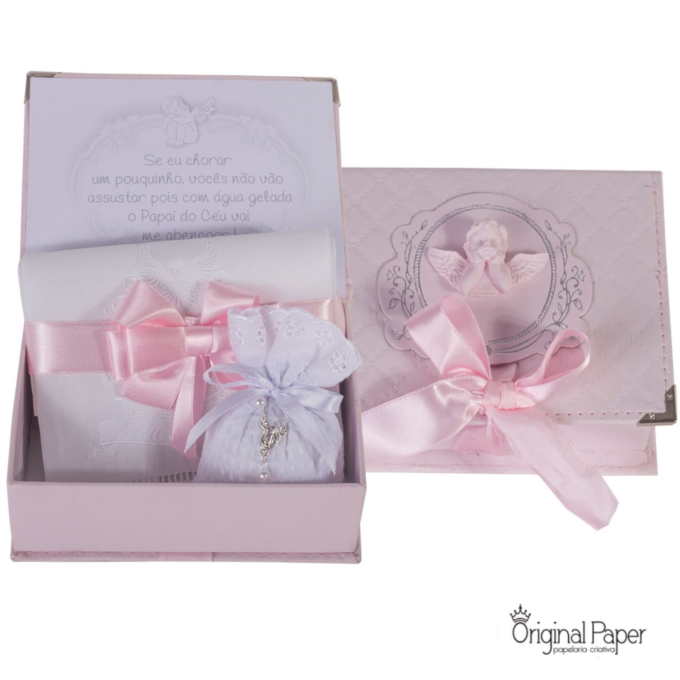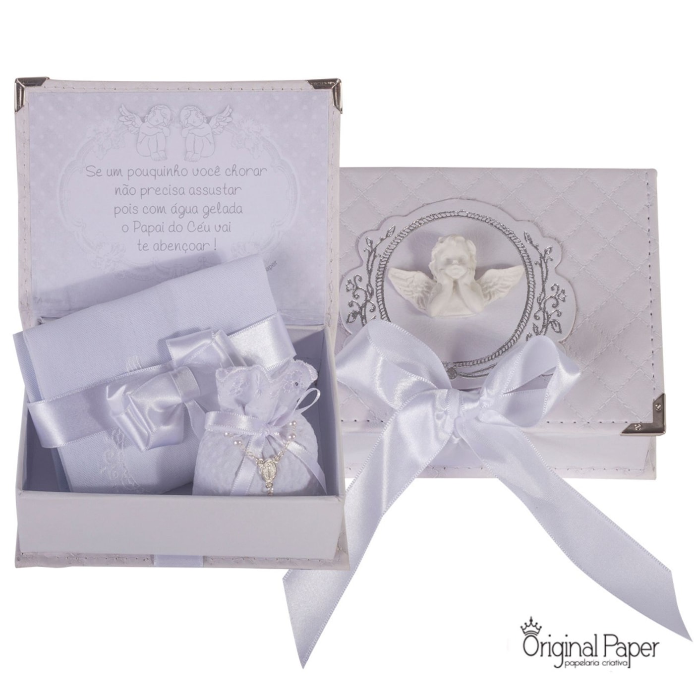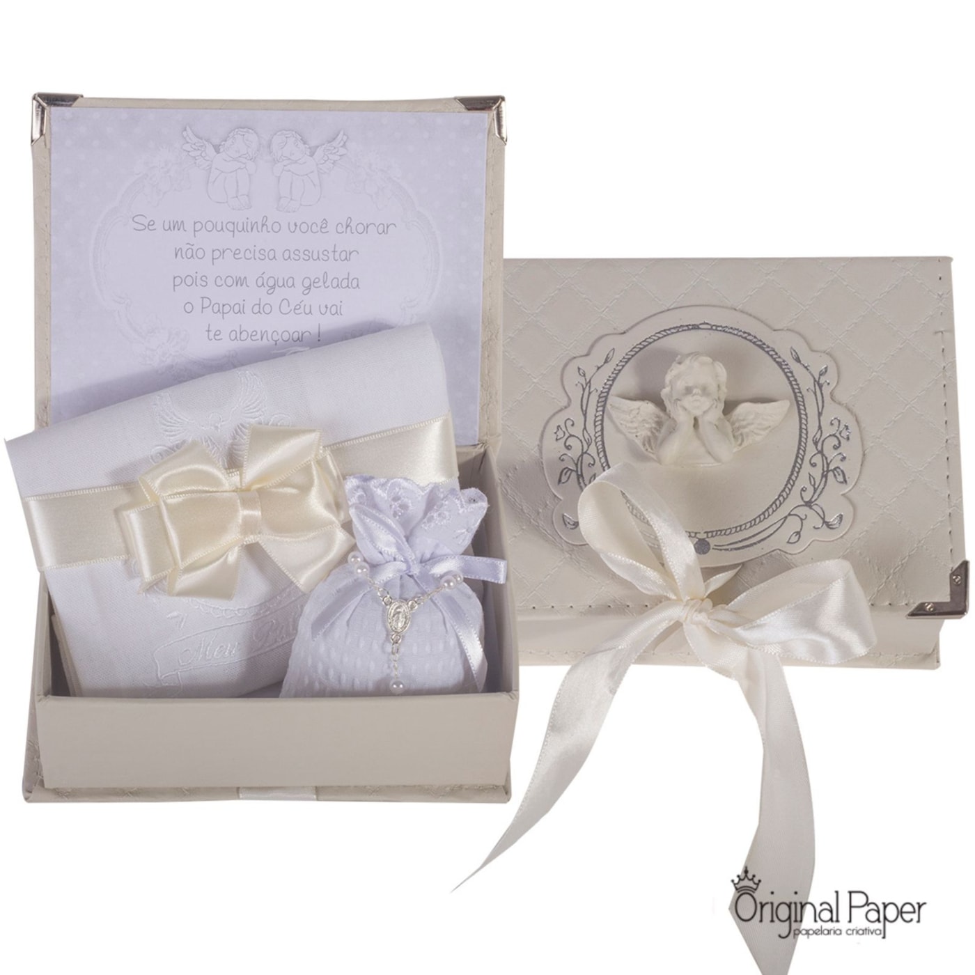 - Contém uma linda toalhinha em linho bordada do batismo e um sachê perfumado com mini terço.