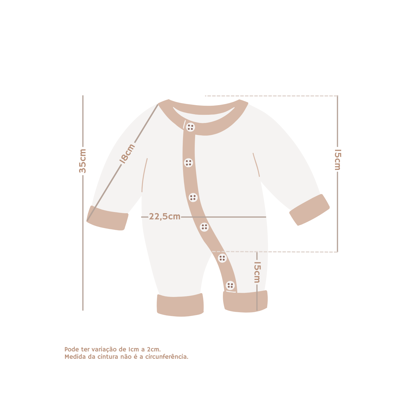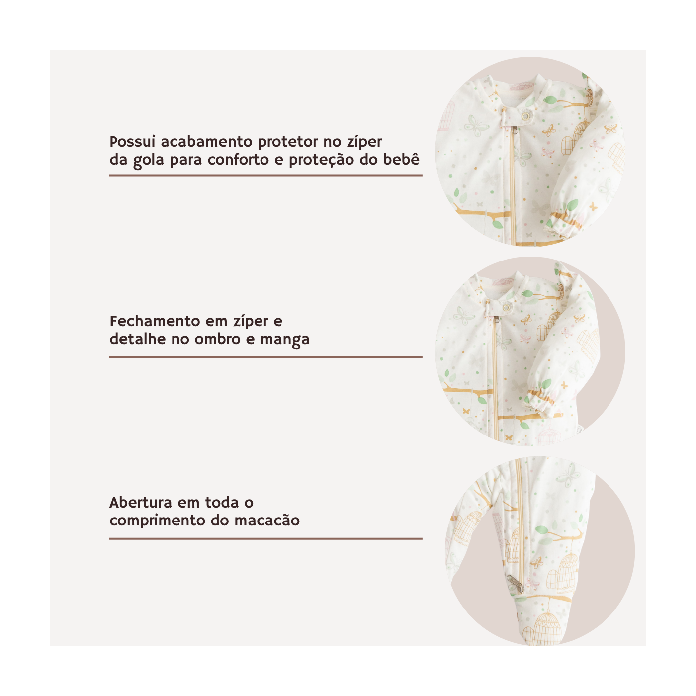 O grande diferencial está na abertura frontal com zíper, que facilita na hora de vestir e trocar o bebê, trazendo mais praticidade sem abrir mão do cuidado.