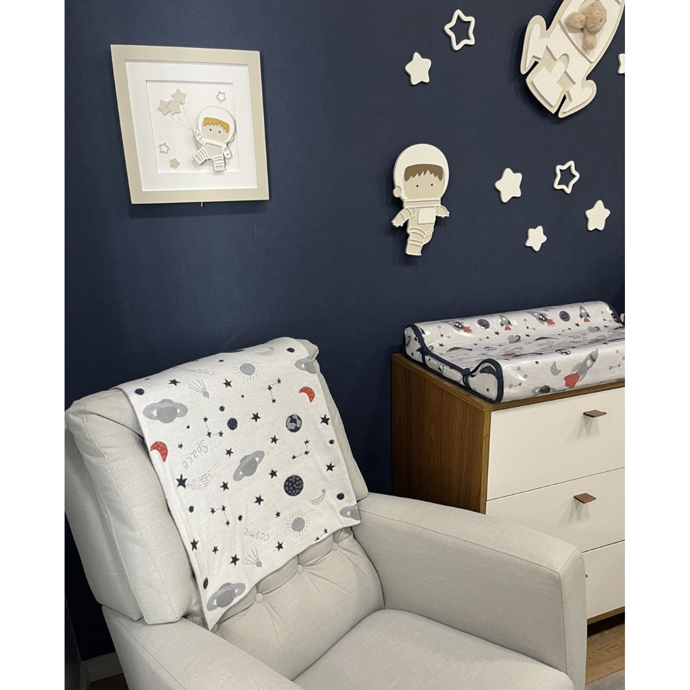 Com fundo off white e estampa exclusiva de planetas na cor marinho, ela traz um toque lúdico e sofisticado, ideal para compor o enxoval de quartos com temas como astronauta, espaço sideral, universo ou planetas. Seu tamanho de 90x90 cm é versátil, podendo ser usada no colo, no carrinho, no berço ou como complemento decorativo.