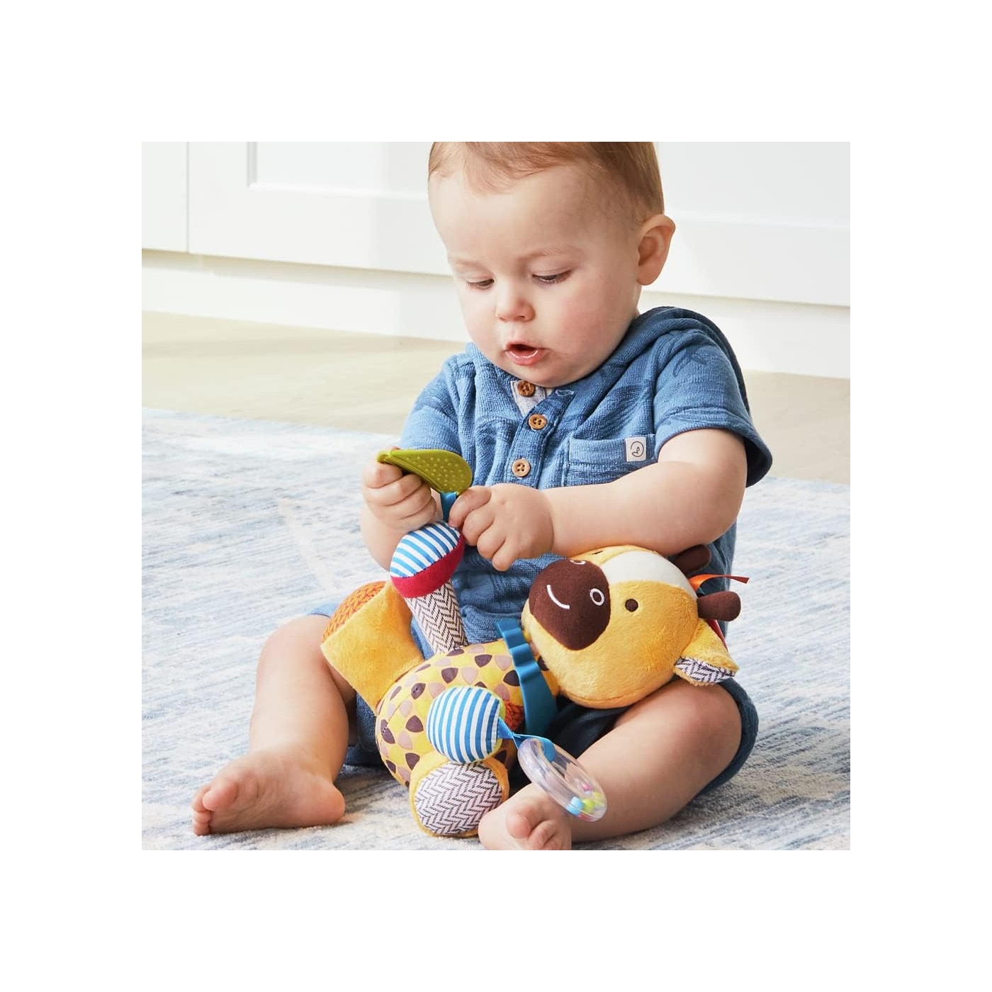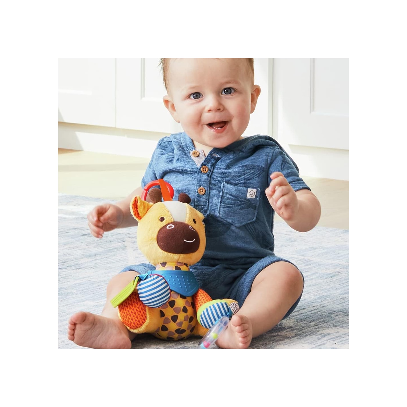 Um brinquedo macio e um mordedor cheio de texturas, padrões e sons para o bebê explorar os chocalhos, tecidos e muito mais. O Móbile de Atividades Bandana Buddies Girafa da Skip Hop vem com alça e pode ser usado no pulso da mamãe, no carrinho do bebê ou na cadeirinha de carro para acesso rápido. Com várias atividades sensoriais, este lindo companheiro é ideal para divertir seu bebê em casa ou em qualquer lugar.