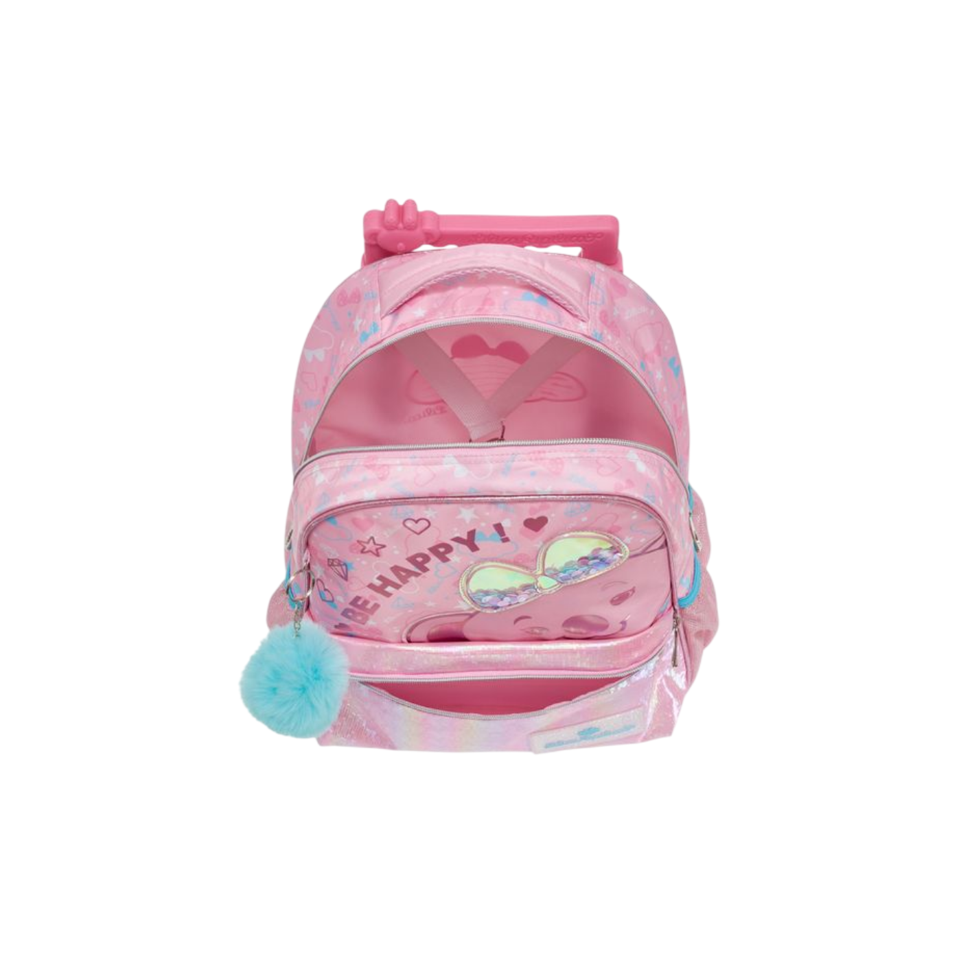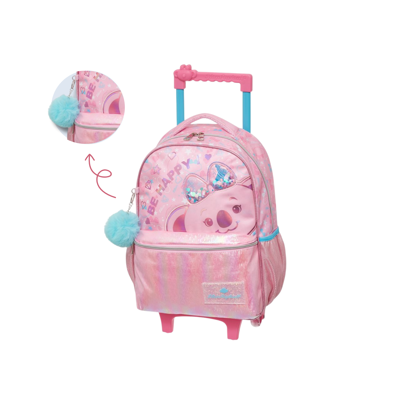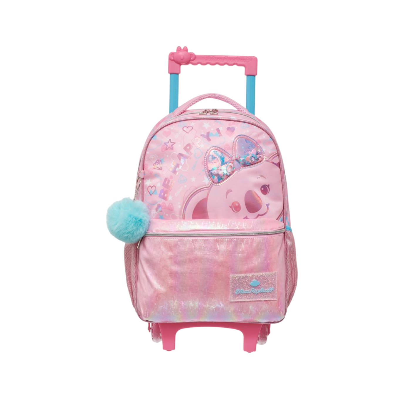 Com tons de rosa holográfico cintilante e a estampa fofa da Lilica Koala, a mochila traz o lema “Be Happy!”, inspirando positividade e diversão. O aplique com glitter líquido e lantejoulas, junto ao pompom azul decorativo, adiciona um toque fashion irresistível ao visual.