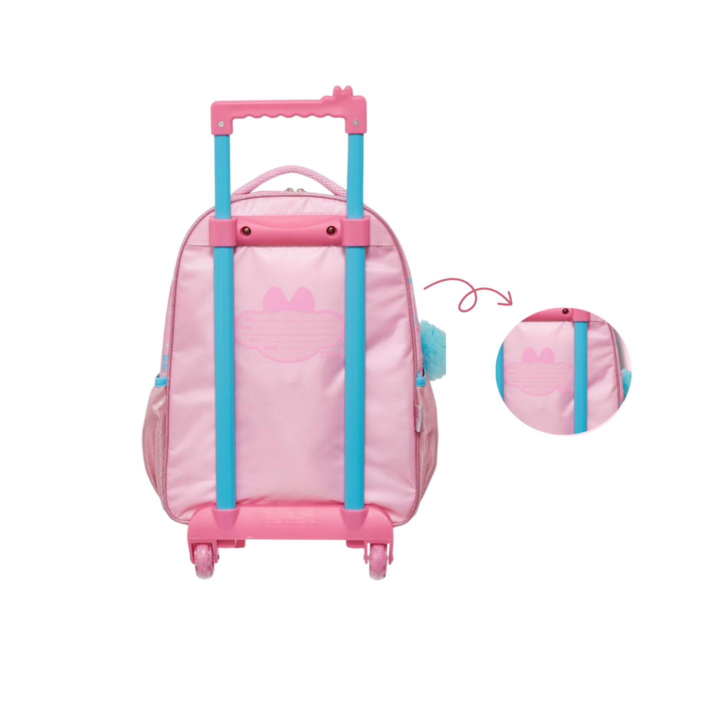 Equipada com 2 rodinhas resistentes e haste retrátil, garante deslocamento suave e confortável para as crianças. Conta ainda com alça de mão, oferecendo versatilidade no transporte.
