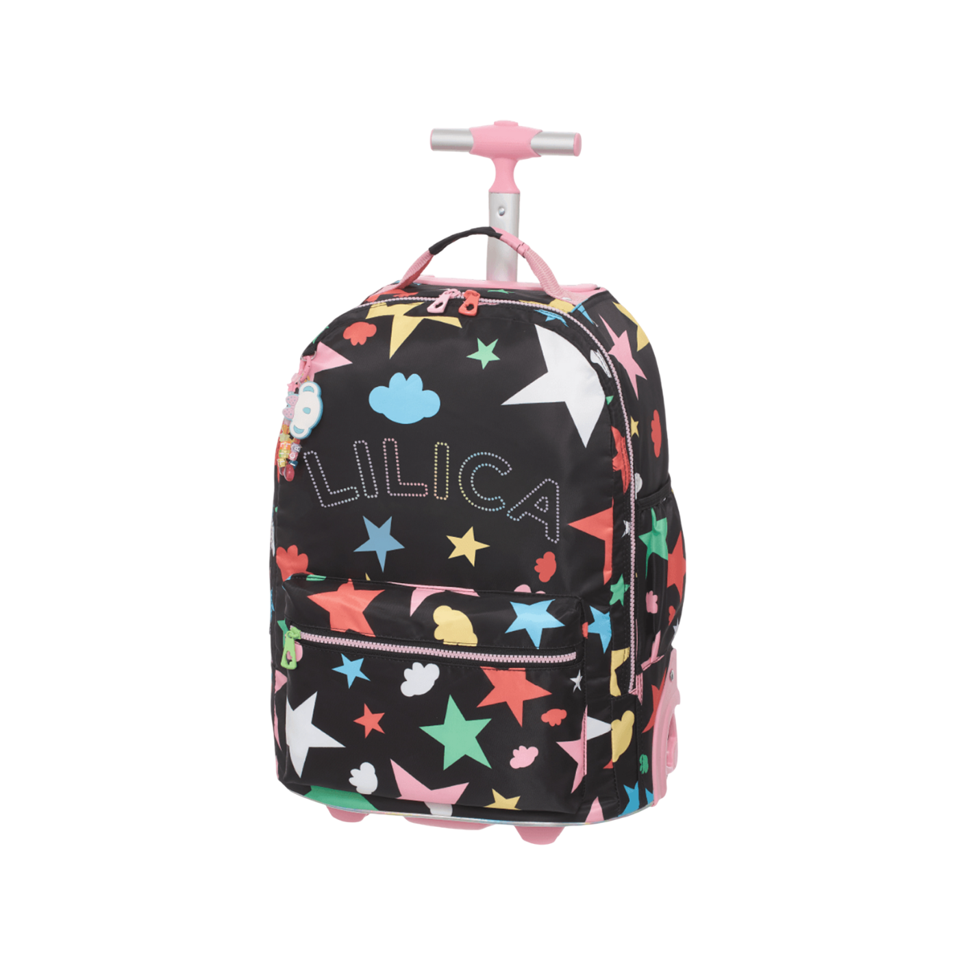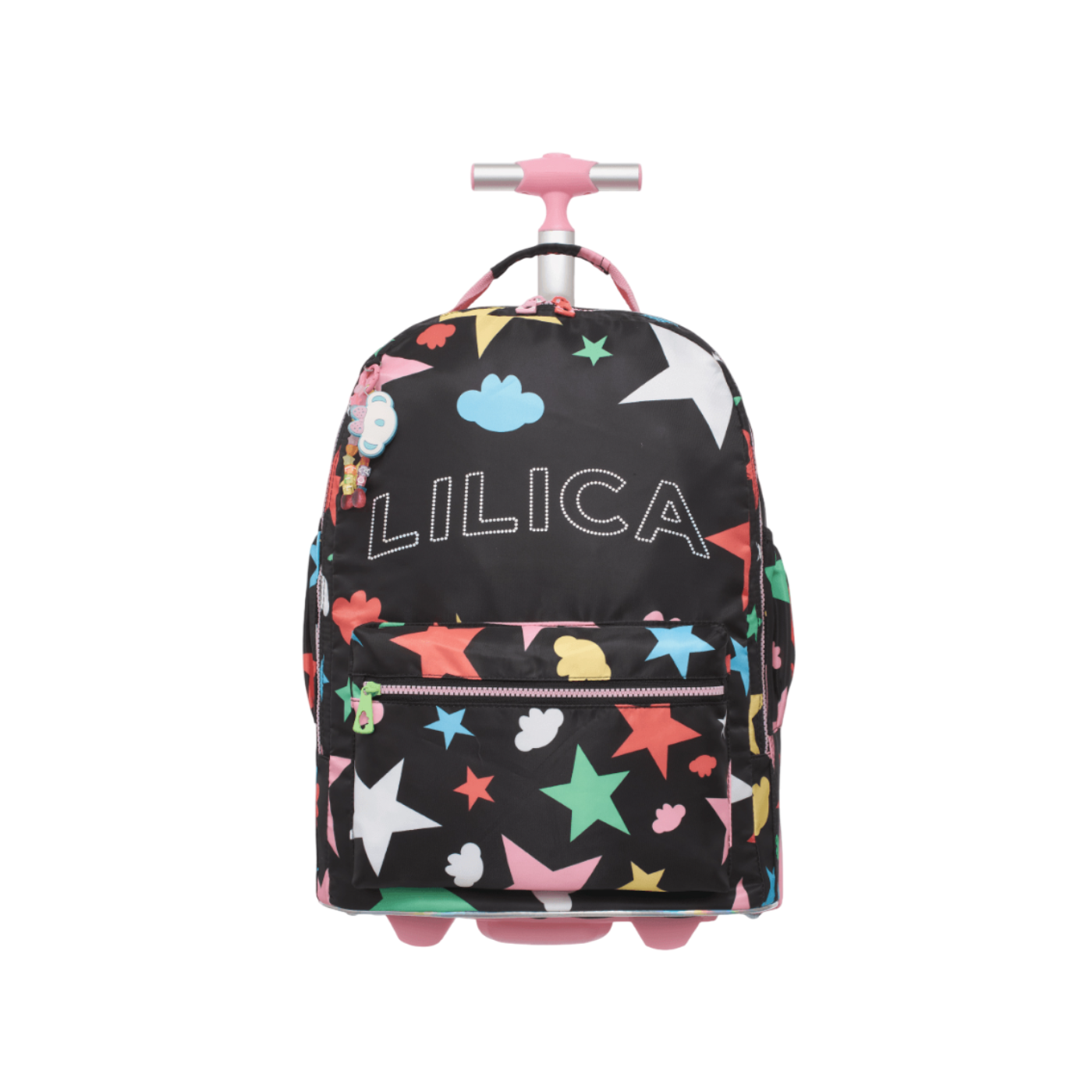 O visual moderno encanta logo no primeiro olhar. Com fundo preto, a estampa de estrelas e nuvens coloridas cria um contraste divertido e sofisticado, enquanto o nome Lilica em material com efeito que muda de cor traz um toque especial e cheio de personalidade. Para completar, o pingente de pompom com o rostinho da Lilica adiciona um detalhe lúdico e irresistível.