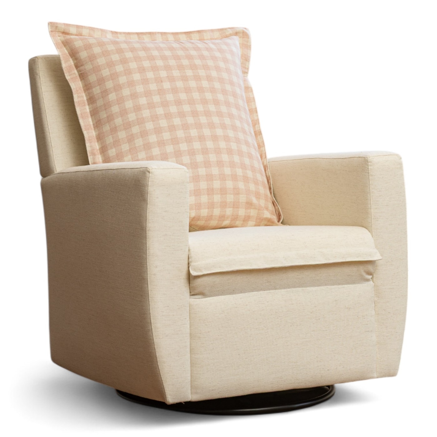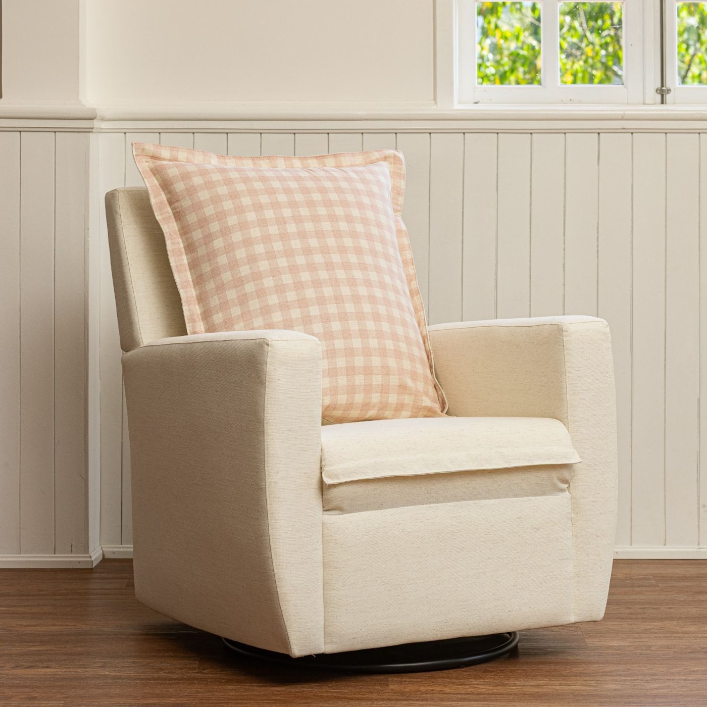 Poltrona de Amamentação Serena com Pés Giro + Balanço Linho Cru com Encosto Xadrez Rosa