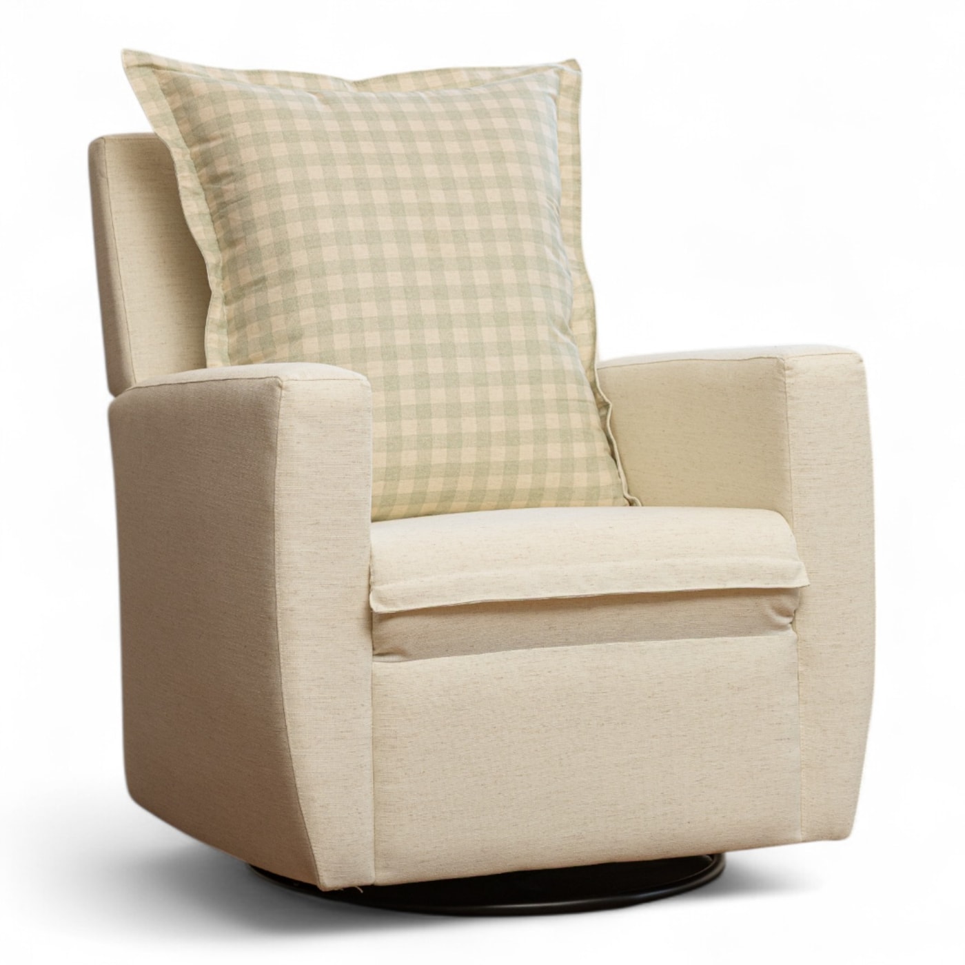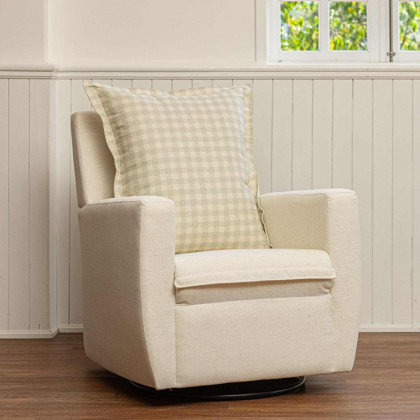 Poltrona de Amamentação Serena com Pés Giro + Balanço Linho Cru com Encosto Xadrez Verde