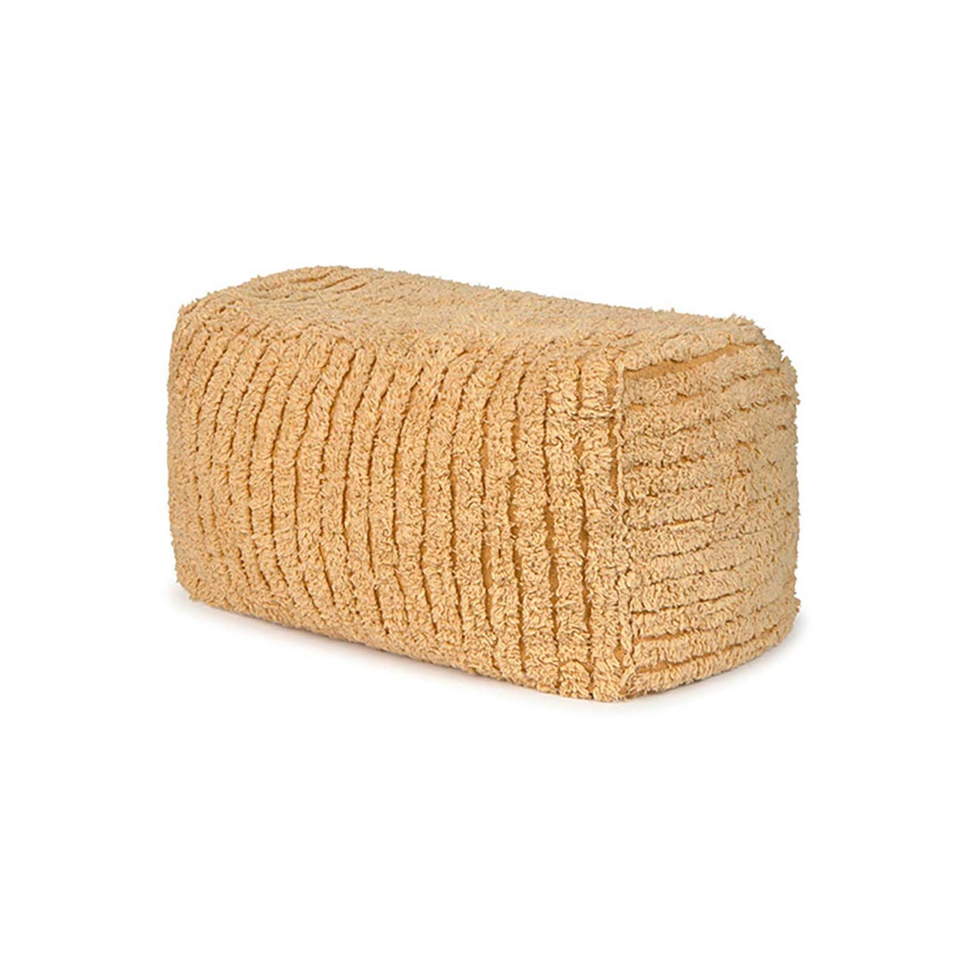 Pufe retangular e fofo em cor mel claro, simulando um palheiro.