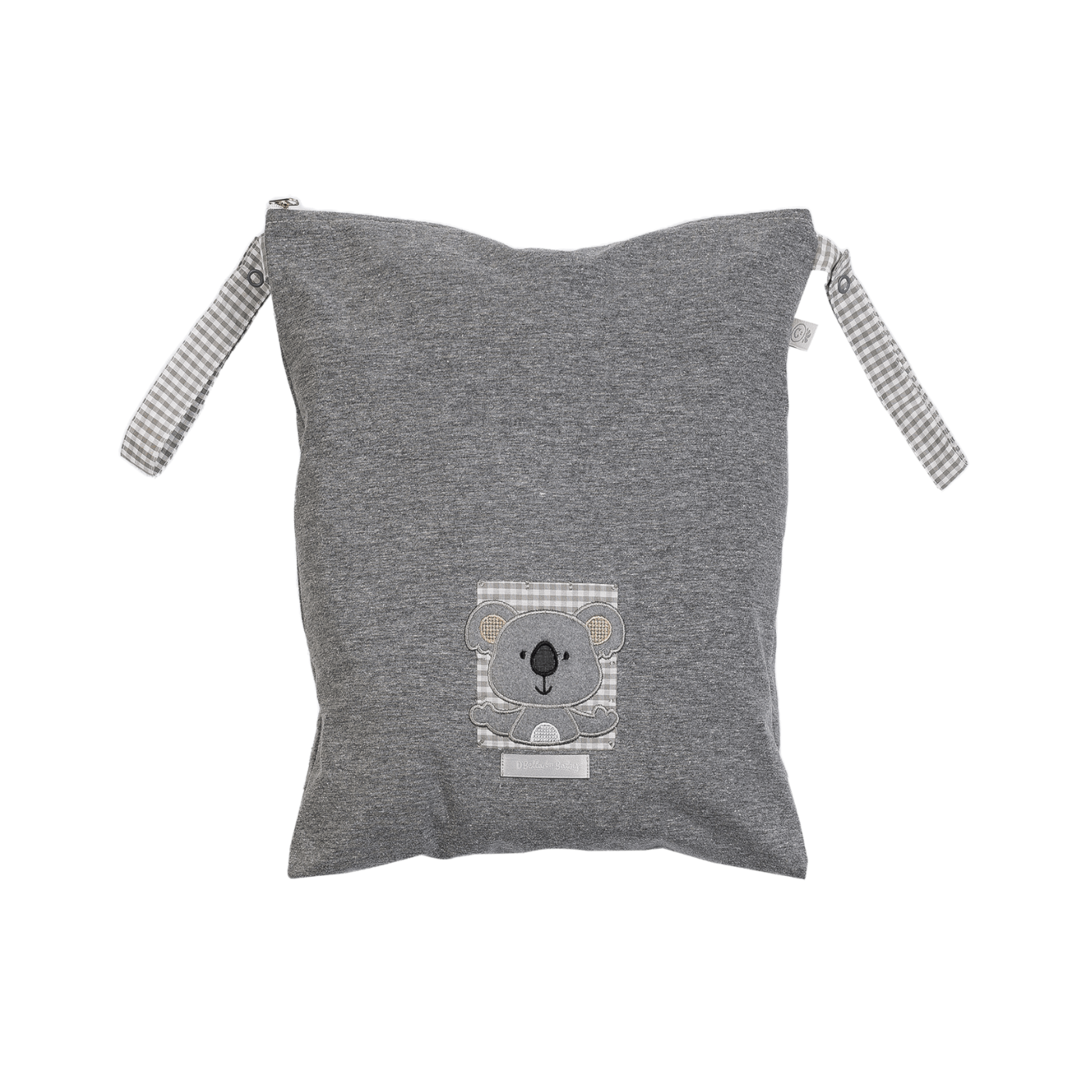 Em malha algodão egípcio por fora e impermeável com plástico interno. Fechamento em zíper com alças para pendurar no carrinho ou aonde quiser.