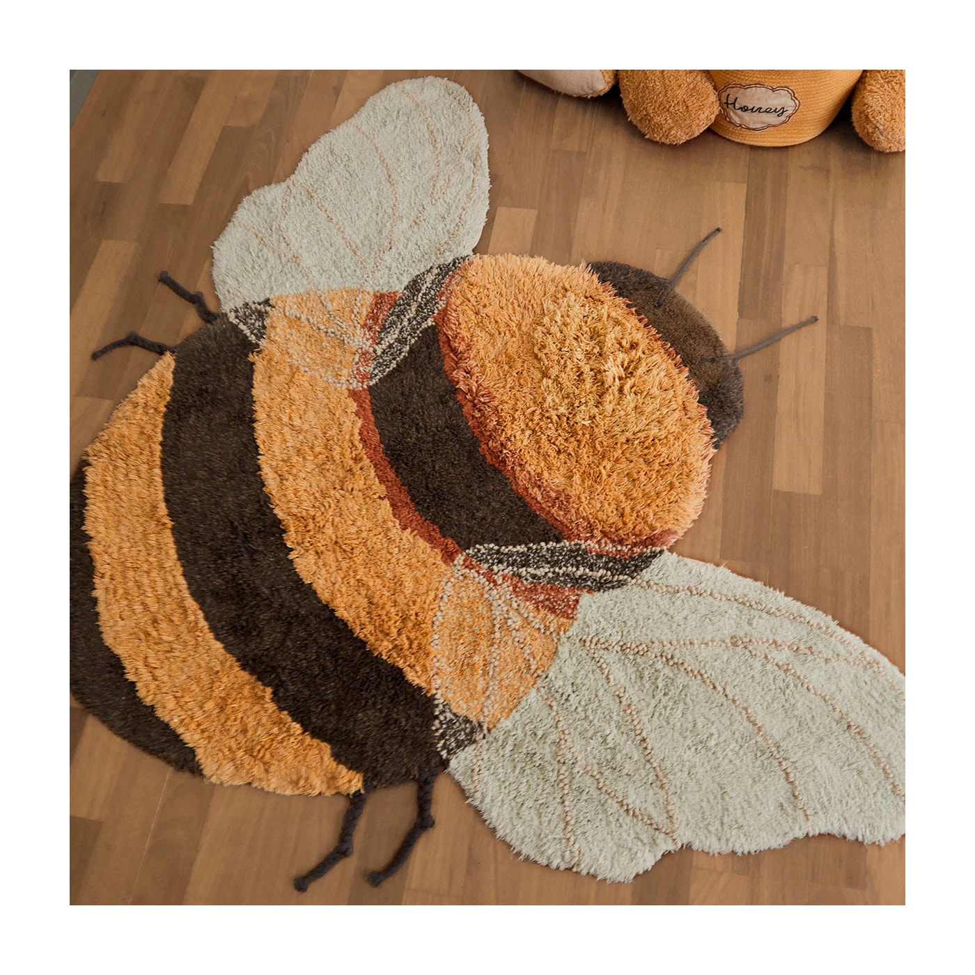 Tapete silhueta em forma de abelha, com corpo listrado nas cores Mel e Cinza escuro e asas em azul claro. Parte da abelha é fofa com pelos mais longos, e as asas são delicadamente feitas à mão para criar um efeito de transparência. Finalizado com cordões cinza escuro como antenas e pernas cinza escuro cuidadosamente trançadas.